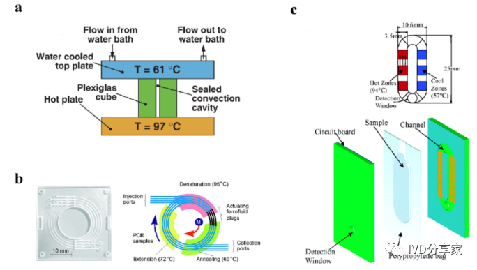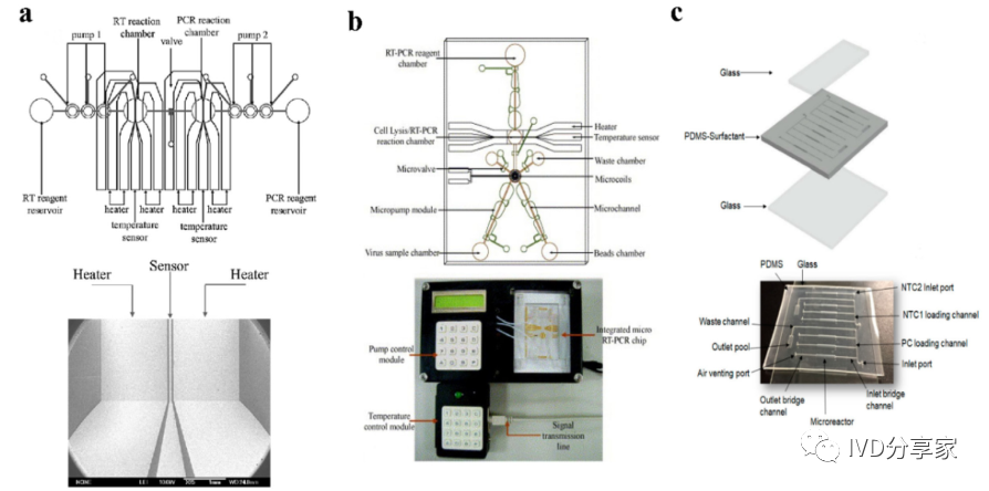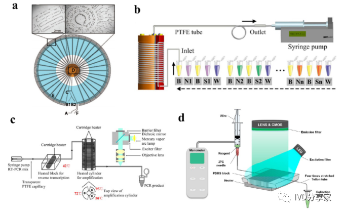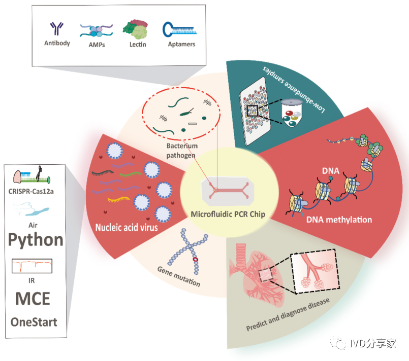 微流控PCR芯片概览 2、结合qPCR的微流控芯片 3、结合mPCR的微流控芯片 4、结合dPCR的微流控芯片 ddPCR技术将PCR反应液分成大量的纳升至皮升,同时在这些小液滴中进行PCR扩增,分析扩增后液滴的荧光信号,计算出目的基因的拷贝数。以液滴为反应单元的PCR系统系统结构更简单,成本更低,结果更准确。Chen等人使用水相通过微通道阵列分散成稳定的油包水乳液液滴,并进行高动态范围的dPCR反应。事实证明,这种经济有效的方法不仅节省了复杂的微流控设备和控制系统,而且大大抑制了材料损失和交叉污染。此外,Wang等人使用压缩空气驱动流体产生液滴,无需外部微阀即可实现实时监测。该系统只需要一个恒温加热器即可实现dPCR所需的稳定热循环,实现每个热循环中液滴荧光的实时检测,简化了传统的dPCR过程。 在现有的一些ddPCR系统中,液滴发生器产生液滴后,需要将液滴转移到其他模块进行扩增和检测,可能会导至转移过程中液滴丢失,结果不准确。在转移过程中存在交叉污染的风险。如张等人采用喷墨打印技术,在油相中产生单分散液滴,然后稳定分散到毛细管中,简化了乳化过程,大大减少了试剂的损失,且生成的液滴在不同温度下是连续的。该方法应用于携带目标DNA的阳性液滴,并利用该系统对三个数量级不同数量的DNA进行定量评估。Wei等人开发了一种新型 dPCR 芯片,它将液滴产生、液滴阵列自组装、PCR 扩增和荧光检测集成到一个设备中。它的特点是制造成本极低、定量能力强且有小型化的潜力,满足DNA分子定量标准。 随着微流控技术的成熟,基于微流控技术的dPCR技术发展迅速。两者结合可以避免繁琐的样品分散操作,在短时间内自动形成一大型的独立反应单元,通量高,提高了准确度和灵敏度。与传统的qPCR技术相比,dPCR技术具有极高的灵敏度、精密度和特异性,特别适用于细微的拷贝数变异、稀有基因突变和核酸绝对定量。广泛应用于医疗、微生物检测、食品安全等领域。 微流控PCR芯片的结构类型 不同样式的微流控PCR芯片的示意图。红色表示变性,蓝色表示退火,黄色表示延伸 1、Micro-chamber PCR chips 3、Spiral microchannel PCR chips 4、Oscillating-flow PCR chips 5、 Closed-loop PCR chips 6、Straight channel PCR chips 7、Others PCR chips 微流控PCR芯片的应用 随着微流控技术的快速发展,微流控PCR芯片正朝着结果简单、功能集成、便携和一次性的方向发展。微流控PCR芯片现在被用于识别病原体、核酸病毒和基因突变,以及预测和诊断疾病和检测低浓度样品。COVID-19正在席卷全球,尤其是现在。我们的共同目标是创造既便携又集成的核酸检测技术。微流控PCR芯片技术的进步,赋予了生物、医学等领域巨大的应用价值。 1、与病原体检测相关的微流控PCR芯片 2、与核酸病毒检测相关的微流控PCR芯片 3、基因突变检测相关的微流控PCR芯片 4、与疾病预防和诊断相关的微流控PCR芯片 5、与DNA甲基化检测相关的微流控PCR芯片 6、与低丰度样品检测相关的微流控PCR芯片 结论和未来展望 尽管典型的PCR反应过程简单明了,化学扩增效果明显,但对硬件条件的依赖仍然是PCR广泛使用的一个重要障碍。提高热循环率、最小化设备和使用更少的化学品需要进一步开发。传统的台式热循环仪仪器体积大,试剂消耗大,导至系统热容量增加,进而降低了温度转变速率和反应速率。这些缺陷可以通过PCR设备的小型化来解决。近几十年来,微流控PCR设备的发展有了很大的进步,改变了传统的核酸扩增PCR方法体积大、成本高、耗散大、易污染和降解等问题。热传导速度加快,提高了热循环的效率。 微流控PCR已与多种检测方法相结合。其中,荧光检测是最灵敏、最方便的检测方法。开发低成本、高通量、高速的检测方法是未来研究的重点。系统集成和自动化可以减少手工操作、减少交叉污染及试剂和样本消耗。在COVID-19的趋势下,集自动化和小型化于一体的检测平台是未来的发展方向。 本综述讨论了PCR技术(PCR、RT-PCR、dPCR、mPCR)与微流控芯片上各种通道结构的结合,并介绍了相关的检测方法。还总结了一些已报道的生物分子分析应用,由于芯片加工制造平台还不够普及,微流控PCR技术设备仍需要更好的改进。核酸提取、扩增和检测的一体化将是未来研究的重要方向。 本研究得到国家自然科学基金面上项目(81973569, 21727814, 21621003, 82130113)、四川省科技厅重大专项(2019YFSY0046)、四川省科技厅区域创新合作项(2020YFQ0032)等资助。 原文链接:https://doi.org/10.1016/j.trac.2022.116737 |