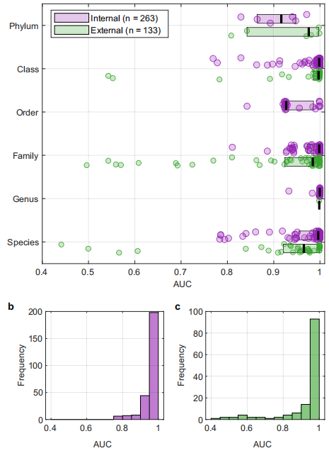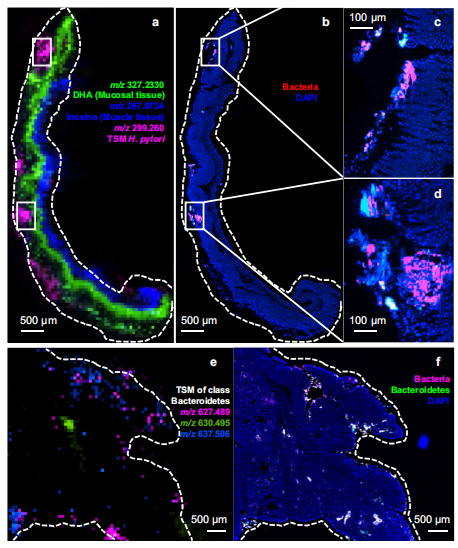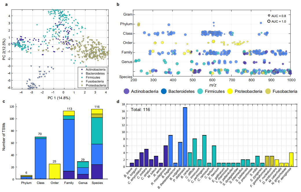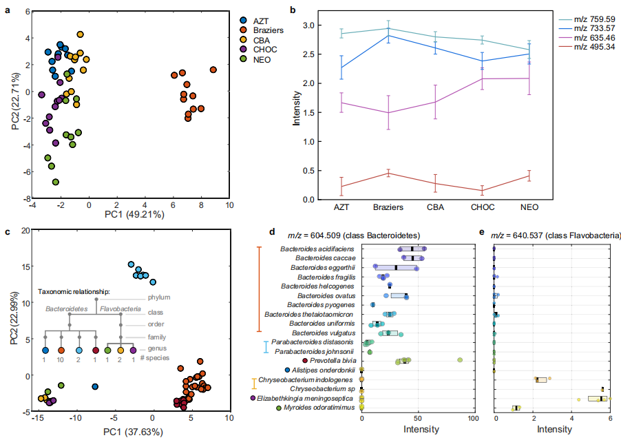 快速、可靠的细菌检测和鉴定对于临床诊断、个性化用药和预防治疗耐药性至关重要。传统的基于培养的方法既耗时又费力,且无法检测未知和难以培养的细菌物种。近年来,基质辅助激光解吸/电离-质谱法(MALDI-MS)已迅速应用于临床实践,基于独特的蛋白质谱来鉴定细菌,但与传统方法一样存在耗时的分离步骤。 近日,杂志Nature Communications上发表了一篇题为“Universal, untargeted detection of bacteria in tissues using metabolomics workflows”的文章。作者描述了一种基于生物标志物的策略,利用细菌小分子代谢物和脂质,使用质谱(MS)直接检测复杂样品中的细菌。作者确定了359个分类群特异性标记(TSMs),并将其应用于健康和癌变胃肠道组织以及粪便样本的细菌原位检测。作者证明了该工作流程在使用标准的基于质谱的分析方法检测细菌具有普遍适用性。 图片来源:Nature Communications 主要内容 分类群特异性标记的可行性 细菌图谱包含233种不同细菌的3274个菌株,隶属于机会致病菌和共生菌的5门、11纲、23目、47科、81属。包含所有233种细菌代谢物的整个训练数据集中共检测到5866个独特的m/z值,其中359个特征在一定的系统发育水平上是特异性的(下图c),并被认为是分类群特异性标记(TSMs)。 在门级、纲级、目级、科级、属级和种级分别检测到6、70、25、113、29和116个TSM。大多数这些标记都是在拟杆菌门的成员中发现的(下图c),这表明该细菌门的代谢明显不同。在属水平上发现了29个TSMs,分别来自放线菌门、厚壁菌门和拟杆菌门。在物种水平上发现的TSM数量最多,有116个标记来自34个细菌物种(下图d)。这相当于符合检测条件的细菌种类的36%。 分类群特异性标记概述。图片来源:Nature Communications TSMs定量细菌的能力 在种水平上发现了8个艰难梭菌的TSMs。结果发现艰难梭菌物种水平的TSMs丰度在不同的培养基中有所不同(图b)。对同一分类单元的不同类群内的标记丰度研究发现,虽然TSM表达可能在单一细菌物种中保守,但这些水平在相同系统发育水平的不同成员之间经常丰度差异很大。例如m/z 640.537在Flavobacteria所有成员中表达,但不同物种之间的丰度差异很大(图e)。这突出了使用基于测序的分析进行平行确认,以便进一步收紧TSM选择的标准的重要性。 TSM定量能力的评估。图片来源:Nature Communications 在细菌培养物上生物标记物的验证 作者使用了“内部”和“外部”两个数据集测试TSM是否可用于鉴定纯细菌培养物。使用与训练数据库相同的方法,从所有文件中提取359个变量的峰值强度。在内部数据集中,确定了263个变量的AUC,而对于外部数据集,确定了134个变量的AUC。内部和外部数据集变量的中位AUC值分别为0.997和0.985(如下图)。结果表明,TSM特征中的许多都是高度特异性的。 使用两个验证数据集验证TSM。 图片来源:Nature Communications 在复杂样本中直接检测TSM 为了证明TSMs在复杂生物样品中检测细菌的适用性,作者尝试检测不同组织中细菌的存在和分布。幽门螺旋杆菌感染后1周的小鼠胃组织中,标记物m/z 299.260 (Helicobacteriaceae科)具有明显的热点模式;16S rRNA FISH分析显示在相同的位置细菌存在热点(下图a-d)。这些细菌很可能确实起源于幽门螺旋杆菌。 在小鼠结直肠癌组织中,可观察到一些属于拟杆菌门类的标记物,它们是丰富的肠道微生物。TSMs和16S rRNA FISH成像揭示了类似的微生物定位热点的模式(图e,f)。FISH和TSMs之间标记强度的差异可能与实际的局部细菌组成以及不同标记之间的电离反应差异有关。 在复杂样本中直接检测TSM。 图片来源:Nature Communications 总结与讨论 作者编制了基于小代谢物的质谱分析技术的最全面的细菌小代谢物谱数据库。数据库的物种覆盖率仍然很低,只有233种,主要是机会致病性物种。高系统发育水平的标记(如门)主要用于拟杆菌门,标记的表达在该水平上的不同成员之间存在差异;较低系统发育水平的标记可用于更广泛的细菌群,但丰度也受到不同培养条件的影响。作者确定了359个分类群特异性标记(TSMs),并将其应用于健康和癌变胃肠道组织以及粪便样本的细菌原位检测。作者证明了该工作流程在使用标准的基于质谱的分析方法检测细菌具有普遍适用性。为了进一步促进这些标志物的临床转化,鉴定每个标志物的分子ID是未来TSM验证的关键步骤。 综上所述,TSMs可作为生物流体中细菌快速检测的有用工具,用于一级筛选应用。未来的研究需要在不同的生物学和临床情况下仔细验证这些标记物。 |