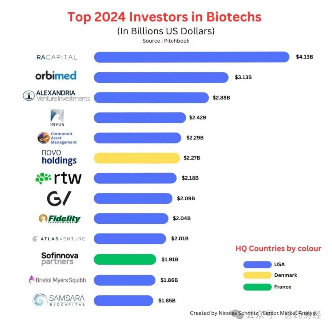 | 由华尔街高级分析师Nicolas Schmitz创建的“2024年全球Biotech投资机构排行榜”一图在医药圈内甚传。图表中列举了投资机构的名称、投资金额以及总部所在国家或地区(美国为蓝色,丹麦为黄色,法国为绿色,投资金额以10亿美元为单位)。 RA Capital以41.3亿美元的投资额位居榜首,OrbiMed(奥博资本)31.3亿美元位列第二名,Alexandria Venture Investments以28.8亿美元居第三位。 以下是对表格中列出的Biotech投资机构的逐一介绍:1. RA Capital Management投资金额:41.3亿美元 总部:美国 - 简介:RA Capital Management是一家专注于生命科学领域的投资公司,致力于支持早期和成长阶段的生物技术公司。该公司以其深厚的行业知识和对科学创新的深刻理解而闻名。