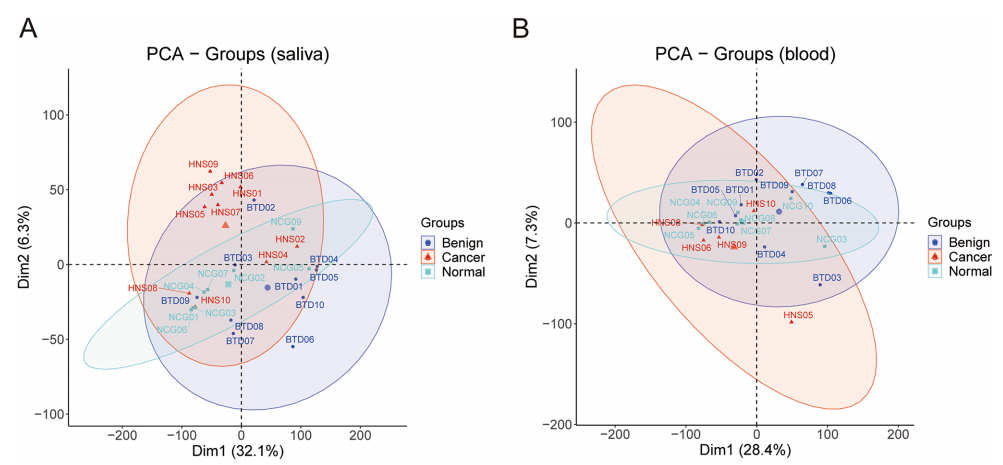 作者使用主成分分析(PCA)来比较不同液体活检的样本相似性。在唾液队列中,组织特征(OSCC、口腔良性肿瘤、正常健康对照)在主要维度上可以大致分离(图A)。而在血液队列中将OSCC与其他组区分开来更为困难(图B)。这表明唾液可能是一种比血液更有效的OSCC检测介质。