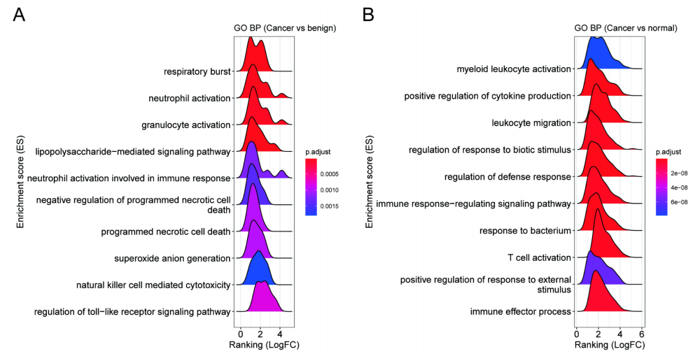与其他组相比,OSCC中许多免疫相关通路的信号增加,包括中性粒细胞活化、抗原加工和递呈、髓系白细胞活化、自然杀伤细胞介导的细胞毒性等。这些发现表明,与健康个体或良性口腔肿瘤患者相比,OSCC患者唾液的免疫谱存在明显差异。