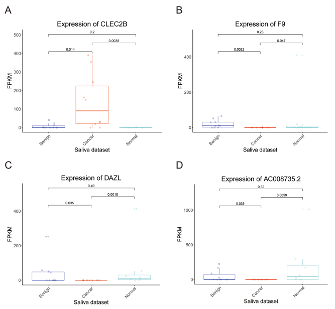 作者对唾液组的分析揭示了OSCC与正常对照以及OSCC与良性肿瘤的7个相交的差异表达基因。与良性肿瘤和正常对照组相比,癌症组的CLEC2B显著上调(图A)。F9、DAZL和AC008735.2在癌症组中显著下调(图B、C、D)。