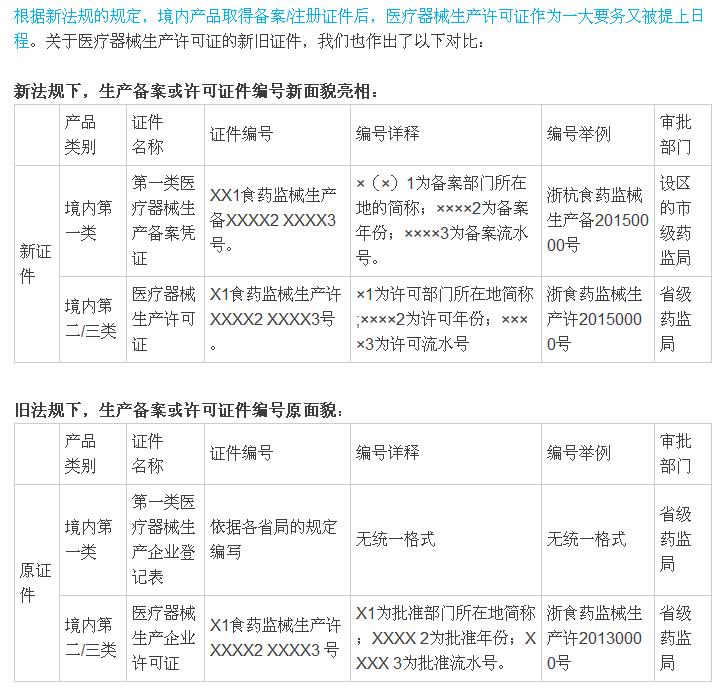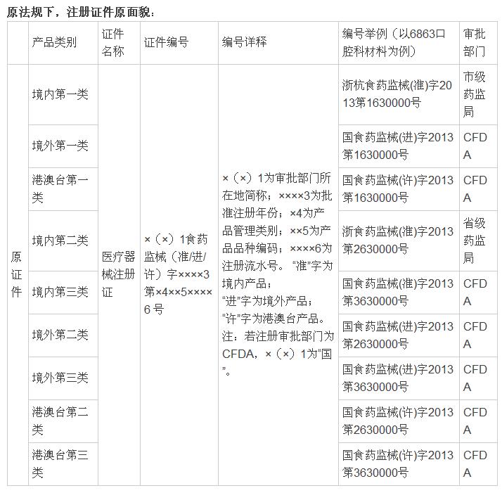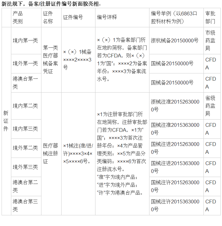 同时,新旧证件所载录的内容区别主要体现在以下方面: 1.医疗器械注册证:新版医疗器械注册证中增加了“代理人地址”、“附件(产品技术要求)”;删除“产品标准”和“售后服务机构”栏。 2.医疗器械生产许可证:新版生产许可证为“医疗器械生产许可证”和“医疗器械生产产品登记表”组合,增加了“生产产品列表”(该栏需列明所生产产品名称和注册号)。生产许可证编号未变化。 3.医疗器械经营许可证: 新版经营许可证添加了“经营方式”、“经营场所”,删除了“ 质量管理人”一栏。经营许可证编号规范化。 综上,伴随着医疗器械法规的更新,医疗器械配套的各种证件信息也随之更新;同时CFDA提醒注册证书批准日期在2014年10月1日以后的企业,若您的证书编号为“国食药监械(进/准/许)字”,请至CFDA换编号为“国械注(进/准/许)”的医疗器械注册证。 |