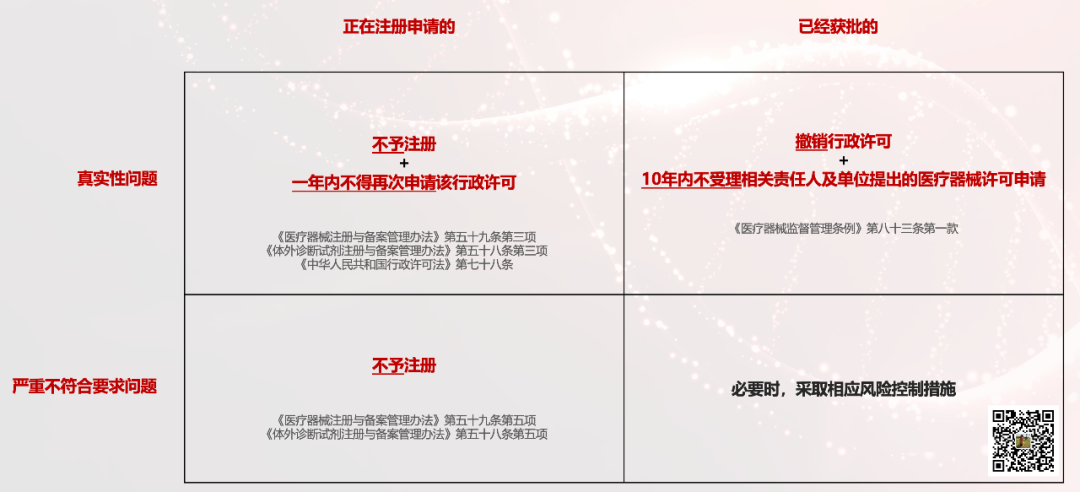 PS:这篇仅代表个人观点。如果我俩理解不一样,那么你是对的。欢迎留言区探讨。 “真实性问题、严重不符合要求问题、规范性问题、符合要求”对于“真实性问题”和“严重不符合要求问题”,都明确了处罚措施:“10年内禁止申请”这一尘封在《医疗器械监督管理条例》第八十三条里的处罚措施,被首次明确的摆上了台面。因为之前不管是《食品药品监管总局关于开展医疗器械临床试验监督抽查工作的通告》(2016年第98号),还是《国家药监局综合司关于印发医疗器械临床试验检查要点及判定原则的通知》(药监综械注〔2018〕45号),都并未明确把这一条写进处罚措施里。而至今有记录的最重处罚结果也只是“不予注册+1年内不得再次申请该行政许可”。此次发布的公告曾经在2023年11月和2024年6月两次公开征求意见。有两个征求意见稿中的“真实性问题”被降级为“严重不符合要求问题”1. 修改受试者信息、样本及试验医疗器械信息、主要试验过程记录、研究数据及检测数据等临床试验数据,严重影响安全性有效性评价;2. 入选排除标准、主要评价指标、重要的安全性指标等关键临床试验活动、临床试验数据或者样本不能溯源在当前合规趋严的环境下,如果一家企业十年内无法进行产品注册,这就是“死刑”。——以“少数极刑”换取“多数老实”,这中间的杠杆越大,说明执行效果越好。这可能也是那两条被“降级”为“严重不符合要求问题”的考量因素。而随着范围被缩窄、目标可锁定,处罚的落地执行就变得可预期了起来。谁会成为第一家“10年内不受理相关责任人以及单位提出的医疗器械许可申请”的IVD企业?从历史来看,药监局会给予企业“主动认错”的时间窗口。2016年6月8日,药监局发布《食品药品监管总局关于开展医疗器械临床试验监督抽查工作的通告》(2016年第98号)。6月8日-8月25日,51家企业主动撤回了101个医疗器械注册申请项目;4个项目被“不予注册”且“不予注册之日起一年内不予再次受理”。于是在8月26日-10月19日,又有44家企业撤回了130个医疗器械注册申请项目。当然,上一次的“紧急避险”只需撤回注册申请,而这一次涉及到“撤回注册证”,可能决策起来就有点肉痛了。不管是12315或者在线信访这样的NMPA公开渠道,还是内部联系注册管理司/审核查验中心这样的非公开渠道——毕竟,“造假拿证”算是行业公敌了,而友商也乐于见到这样的企业被十年禁入。