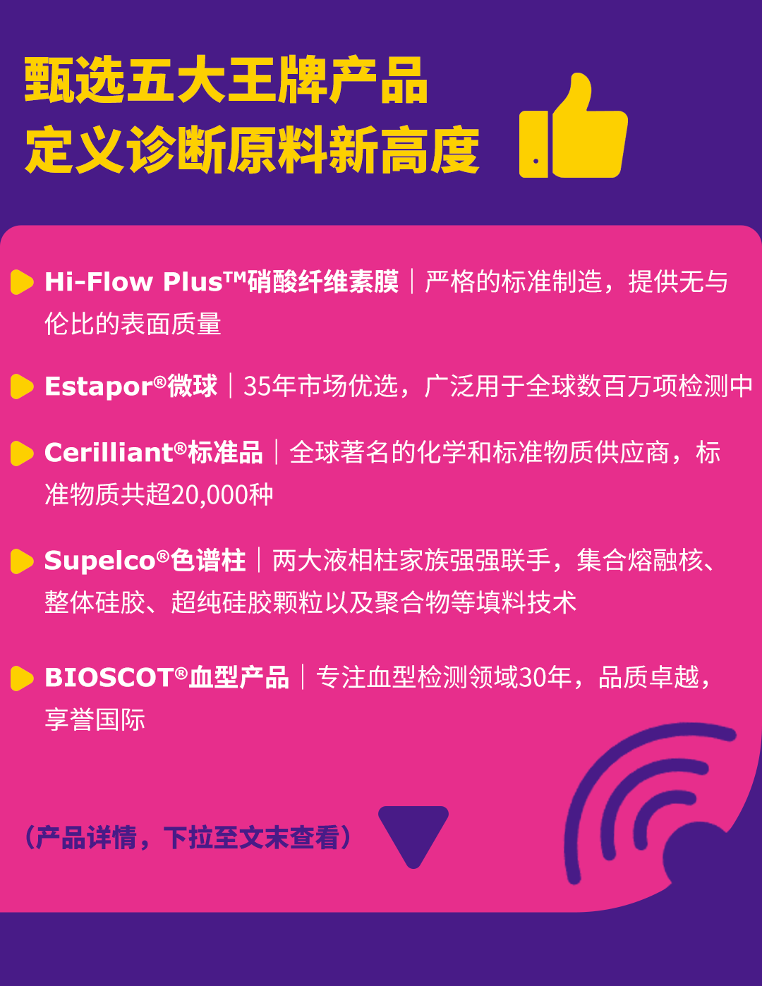 Estapor®品牌已面向IVD厂商化学发光、侧向层析、乳胶比浊等平台供货超35年之久,性能成熟、久经考验,深受客户一致好评。该产品被国际知名品牌广泛用于全球数百万项检测中,同时兼容手动和自动平台,高度可表征、可定制且可提供关键功能性设计,完美匹配IVD厂商需求。