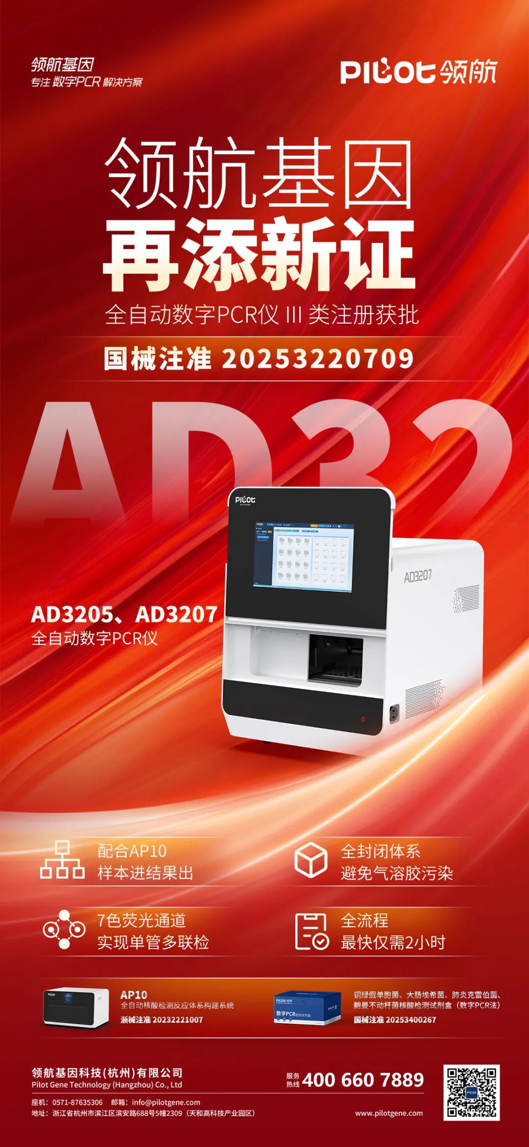 2025年4月2日,领航基因自主研发的全自动数字PCR仪(AD3205、AD3207)通过国家药品监督管理局批准获得III类医疗器械注册证(国械注准20253220709)。这是领航基因新年伊始,继“铜绿假单胞菌、大肠埃希菌、肺炎克雷伯菌、鲍曼不动杆菌核酸检测试剂盒(数字PCR法)”获得III类医疗器械证以后,时隔2月,又一重磅产品获得注册证。双证连发,领航基因以“硬核速度”刷新行业纪录。目前领航基因在数字PCR平台已获证的产品包括全自动核酸检测反应体系构建系统(AP10)及半自动数字PCR系统(D3200)。全自动数字PCR仪的获证,揭示着领航基因平台布局已趋于完善,再加之血流感染检测试剂盒的获证,这标志着领航基因在血流感染精准诊断领域将翻开全自动化的新篇章。 引领基因科技,追求卓越性能 领航基因自主研发的七色荧光全自动数字PCR仪,集液滴生成、PCR扩增、多通道荧光检测分析于一体,从上样到结果输出仅需2小时,真正实现无人值守。全自动数字PCR仪搭配完整的自动化体系、配套的试剂耗材和简洁易懂的判读软件,能够为用户提供更全面、高性能、易操作的解决方案。 持续创新,引领未来 从半自动到全自动,从实验室到临床一线,全自动数字PCR仪获批三类证,不是终点,而是精准医疗的新起点。领航将持续肩负“引领基因科技,护航生命健康”的使命,为全球精准诊断贡献“领航力量”。 |