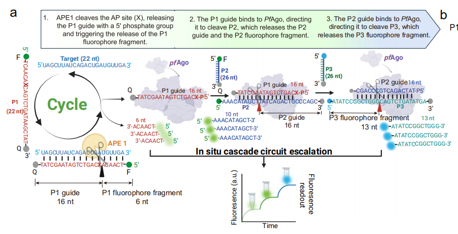 作者设计了一个原位级联信号放大系统,利用串联APE1和PfAgo内切酶的协同作用,命名为NAPTUNE。首先,APE1本身具有高特异性和指数级信号放大能力,能够建立目标核酸检测的正反馈回路。同时,APE1触发的裂解产物可以作为gDNA的向导,在二级和三级探针上激活pfAgo介导的顺式裂解系统,从而将APE1的靶向能力转化为“APE1- argonaut”原位级联扩增荧光信号模式。简单来说,在整个级联反应中,作者引入了三个ssDNA探针,分别为P1、P2和P3。P1介导APE1对靶标RNA的识别和切割,并启动PfAgo对P2的切割;截断P2作为gDNA,与guide-free PfAgo结合,促进了P3的特异性后续切割(如下图)。这种模式消除了复杂放大步骤的需要,使检测过程更快,更具成本效益,适合POCT应用。
