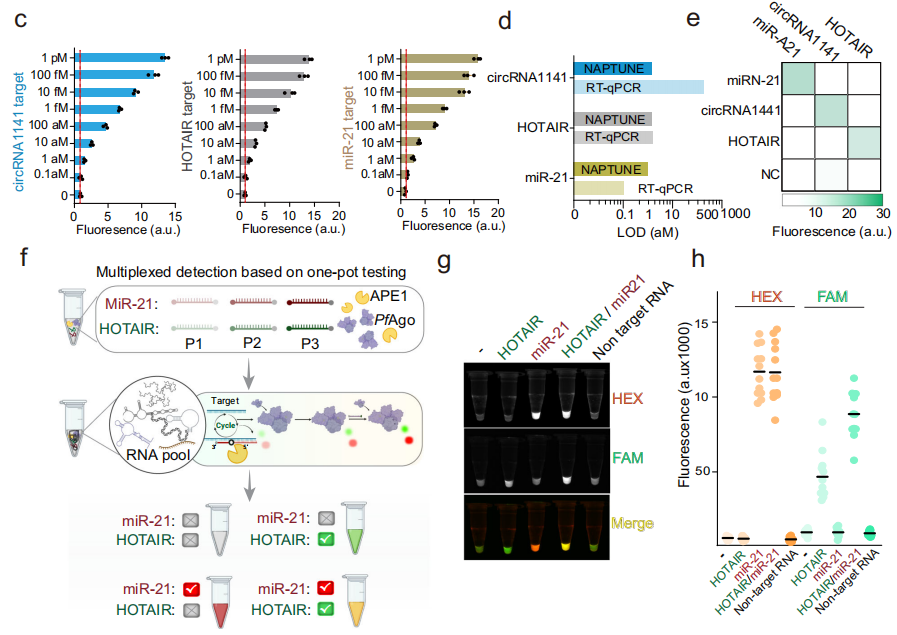 作者选择circRNA1141、HOTAIR和miR-21来证明NAPTUNE平台的可行性。结果显示,NAPTUNE平台对这三种ncRNA表现出良好的性能,灵敏度均低至1 aM(图c),与标准qRT-PCR检测相当(图d);且具有高度特异性,交叉反应性小(图e)。作者进一步证明了NAPTUNE平台在单管中检测双重RNA靶标HOTAIR和miR-21时表现出高敏感和精确性(图h)。