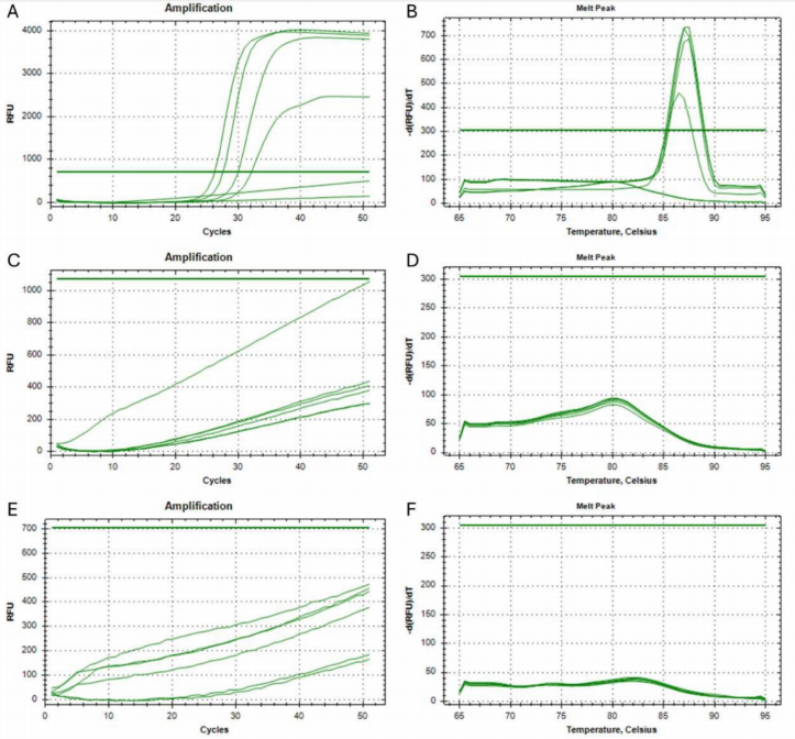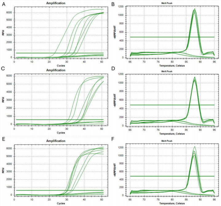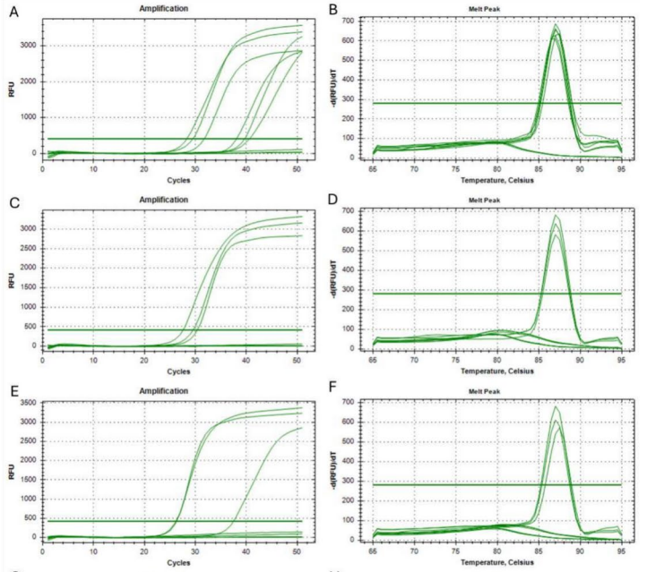 作者使用携带突变的5种人EGFR合成模板来检测该方法的敏感性和特异性。结果表明,该方法能够检测出至少250个目标序列拷贝的5种EGFR突变。从健康人(野生型)或水(NTC)中提取的人类遗传物质样品中没有扩增产物,证实了引物对靶标遗传改变的特异性。对熔解曲线的分析(如下图)也证实了该方法的特异性。