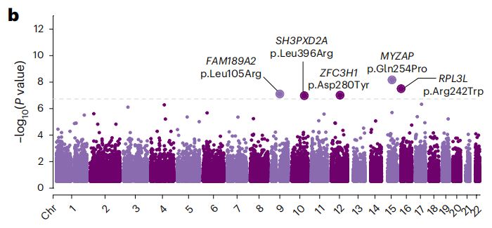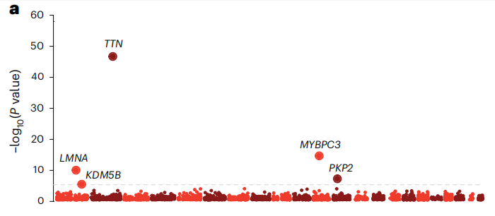 近日,杂志Nature genetics上发表了一篇题为“Sequencing in over 50,000 cases identifies coding and structural variation underlying atrial fibrillation risk”的文章。该研究利用了迄今为止最大规模的这种复杂疾病的测序数据,并评估罕见编码遗传变异对AF风险的作用。结果发现AF与MYBPC3、LMNA、PKP2、FAM189A2和KDM5B基因之间存在关联。AF与罕见结构变异研究中,发现CTNNA3缺失和GATA4重复与AF存在关联。干细胞源性心房心肌细胞中KDM5B的敲除可导至动作电位持续时间缩短和广泛的转录组失调。此研究结果强调了罕见的编码和结构变异对房颤的贡献,包括房颤和心肌病之间的遗传联系,并加深了对这种常见心律失常的罕见变异结构的理解。 图片来源:Nature genetics 主要内容 研究揭示新的罕见变异与房颤相关 作者首先进行了基于外显子组的基因分析,测试了AF与功能丧失(LOF)和有害错义(pDM)突变之间的关系。正如预期的那样,TTN的相关性最强,证实了该基因在房颤发病中的重要作用。此外还发现了四个与房颤相关的新基因(下图a),包括MYBPC3(编码肌球蛋白结合蛋白c3),LMNA(编码层粘连蛋白A/C),PKP2(一种罕见变异强烈促进心律失常的基因),KDM5B(赖氨酸去甲基酶5B)。 测序识别了与房颤相关的新型罕见编码变异。 图片来源:Nature genetics 识别与房颤相关的错义突变 作者对AF的低频和罕见编码变异进行了单变关联测试,发现了5个与AF显著相关的低频或罕见编码变异(下图b)。这些关联包括3个先前报道的错义变异(MYZAP、RPL3L和SH3PXD2A)和两个新的罕见的错义突变关联,FAM189A2(p.Leu105Arg)和ZFC3H1( p.Asp280Tyr),与AF风险增加相关。其中,FAM189A2(p.Leu105Arg)在重复数据集的中得到了验证。 测序识别了与房颤相关的新型罕见编码变异。 图片来源:Nature genetics 罕见的结构变异与房颤有关 作者分析了对照和AF病例预测高影响结构变异。结果显示,CTNNA3的罕见缺失与AF风险增加相关(图a),且在重复数据集的中得到了验证。罕见变异CTNNA3曾被报道在有限病例中致心律失常性右室心肌病,,CTNNA3基因敲除小鼠发生扩张性心肌病。 8号染色体基因组区域内基因的罕见重复与对AF的保护有关。该区域包括编码一个重要心脏转录因子的GATA4,以及其他几个基因(FAM167A,BLK,NEIL2,FDFTI,CTSB)。增加GATA4剂量可能通过改变心房中调节基因网络的转录因子平衡来预防房颤,但这种保护的潜在机制还需要进一步研究。 CTNNA3和GATA4的大结构变异与AF有关。 图片来源:Nature genetics KDM5B缺失导至心房细胞的转录组改变 作者敲除KDM5B进行RNA测序,并进行差异表达分析,以表征心肌细胞中KDM5B调控的基因和分子途径(下图d)。结果确定了619个基因在KDM5B基因编辑后下调,530个基因上调。在显著下调的分子途径中,包括核小体组装、染色质修饰酶、心脏发育和缺氧(图e)。上调的信号通路包括p53信号、离子通道活性、突触信号、心脏传导和心房心肌细胞动作电位(图f)。p53信号的上调过程与心肌细胞死亡和心力衰竭水平升高有关。几个先前与心律失常相关的离子通道和钙结合蛋白上调,包括SCN5A、SCNN1D、SLC12A4和PIEZO1。这些结果表明,KDM5B表达的降低会导至心肌细胞发生深刻的转录和生理变化,这不仅可能影响动作电位,还可能影响细胞存活和代谢。 KDM5B缺失导至心房细胞的转录组改变。 图片来源:Nature genetics KDM5B缺失导至心房细胞动作电位缩短 作者使用KDM5B敲除方法,评估KDM5B在心房心肌细胞中的电生理作用。结果显示,敲除KDM5B,可显著缩短心房心肌细胞动作电位持续时间(如下图),与RNA-seq数据的发现一致,即钾通道的转录水平增加,包括KCNJ3和KCNIP2,引起心房复极化驱动增强。综上所述,此功能研究强调了KDM5B在心房心肌细胞转录编程和电生理中的重要作用。 KDM5B缺失导至心房细胞动作电位缩短。 图片来源:Nature genetics 总结与讨论 该研究利用了迄今为止最大规模的这种复杂疾病的测序数据,并评估罕见编码遗传变异对AF风险的作用。结果发现AF与MYBPC3、LMNA、PKP2、FAM189A2和KDM5B基因之间存在关联。AF与罕见结构变异研究中,发现CTNNA3缺失和GATA4重复与AF存在关联。干细胞源性心房心肌细胞中KDM5B的敲除可导至动作电位持续时间缩短和广泛的转录组失调。此研究结果强调了罕见的编码和结构变异对房颤的贡献,包括房颤和心肌病之间的遗传联系,并扩大了对这种常见心律失常的罕见变异结构的理解。 |