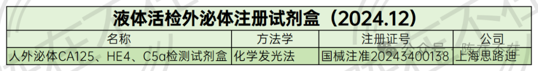 主要是EGFR基因突变试剂盒。 还有两个是与基因甲基化联合检测。 艾德生物拥有第一个肿瘤荧光PCR液体活检注册试剂盒,其2019年获得的二代测序BRCA1/2试剂盒被认为实际检测的是白细胞胚系突变。新羿制造则获得数字PCR肿瘤突变液体活检首证。第一个肿瘤NGS液体活检注册试剂盒花归优讯医疗。 肿瘤基因甲基化 截止到2025年4月,基因甲基化获证38个,其中:37个与肿瘤相关;1个为系统性红斑狼疮。肿瘤基因甲基化试剂盒中:1个样本为石蜡切片,6个为宫颈脱落细胞,其余30个液体活检试剂盒见下表绿色部分。 microRNA microRNA(miRNA)是一类内生的、长度约 20 - 24 个核苷酸的非编码单链 RNA 分子。 截止到2024年12月,microRNA获证试剂盒3个,均为PCR法,见下表。 循环肿瘤细胞 循环肿瘤细胞(CTCs)是一群被认为从原发性肿瘤或转移性肿瘤部位脱离,并在血液中循环的肿瘤细胞。由于它们是完整的活细胞,在循环系统中具有较长的半衰期,并且提供了一些无法通过 ctDNA 分析获得的参数,包括 RNA 和蛋白质分析以及完整的基因组。 捕获 CTCs 进行分析存在重大挑战。CTCs 是罕见事件,即使在转移性癌症患者中,也并不总是存在于外周血中。即使存在,其浓度也非常低,处于每十亿个红细胞和数百万个白细胞中只有一个 CTC 的范围。CTC 标志物可能与原发性肿瘤细胞的标志物不同,并且在治疗过程中也可能发生变化,这使得它们难以靶向定位。 根据《2023年第三次医疗器械产品分类界定结果汇总》,以下建议按第三类医疗器械管理: (四十七)血液循环肿瘤细胞自动分选仪:由精密加样系统(由传输系统、清洗系统、温育系统、混匀系统、软件系统组成)和分选系统(由磁珠吸附模块、样品和磁珠混匀模块、离心模块、照明和UV消毒模块组成)组成。与荧光原位杂交样品处理试剂盒配合使用,用于循环肿瘤细胞的富集,经提取后的细胞用于后续染色计数或其它靶标物质检测。分类编码:22-10。 外囊泡 目前,肿瘤外泌体获证试剂盒仅思路迪一家。通过体外测定人血清外泌体中的CA125、HE4和C5a浓度,并经给定的计算公式计算卵巢癌评分OCS(ovarian cancer score) ,适用于临床上发现有附件包块的女性患者,辅助诊断上皮性卵巢癌。 以上为肿瘤液体活检NMPA注册产品。NIPT及生殖健康,器官移植等方面的液体活检产品未在此列。 液体活检作为一种新兴的肿瘤检测技术,具有无创、可重复等优点,但在临床应用和推广过程中仍面临着诸多挑战: