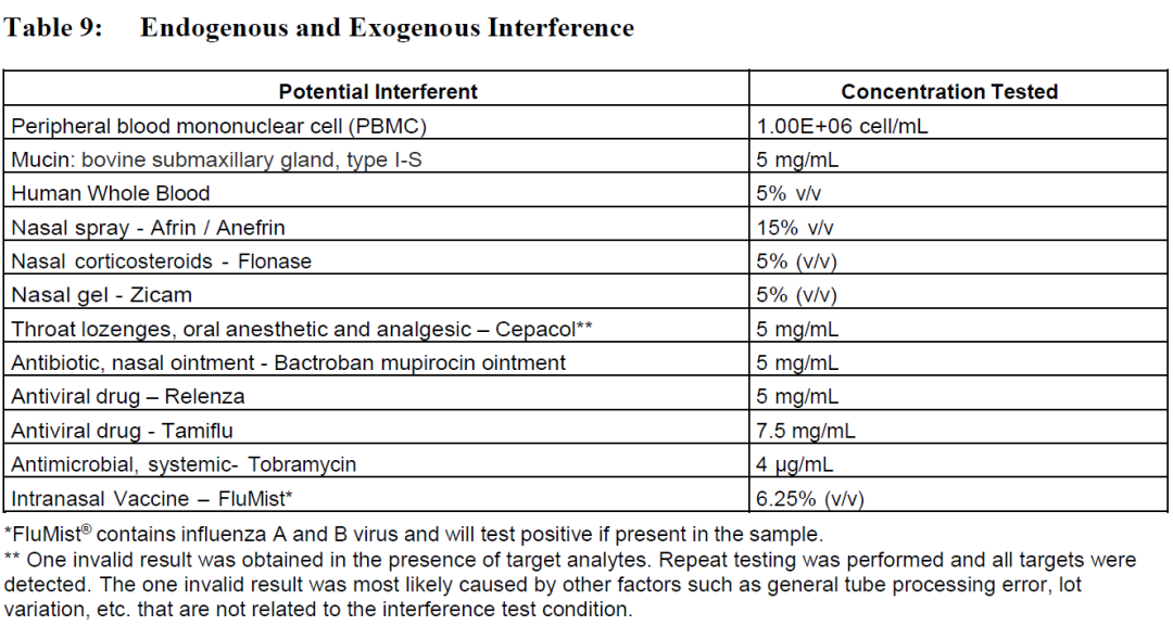 对呼吸道标本中可能常见的潜在干扰物质进行评估,包括外周血单核细胞、黏液、人全血等多种物质,在含有3LoD目标物质的情况下进行测试,结果表明这些物质不会干扰检测,也不会导至阴性样品出现无效结果。