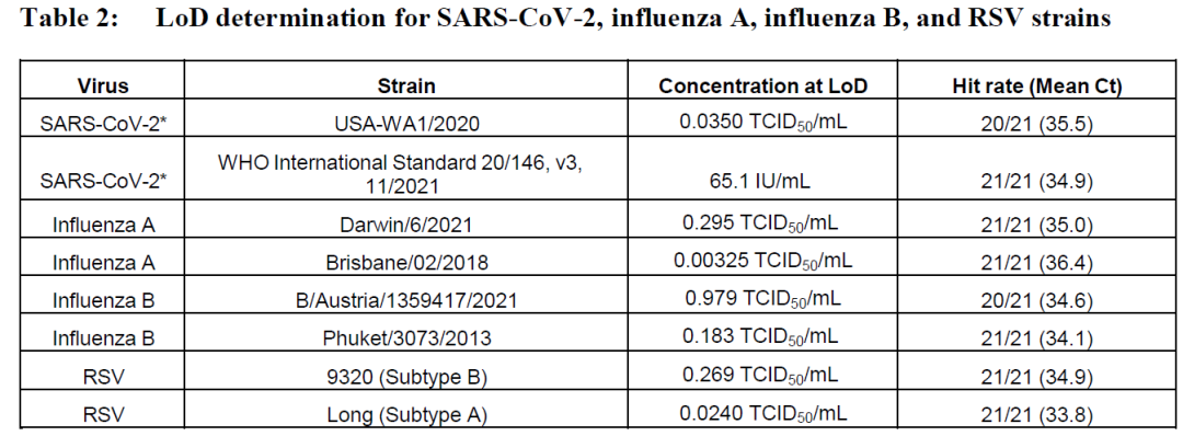 通过对每个目标(SARS-CoV-2、甲流、乙流和RSV)的两个菌株进行评估,确定其最低可检测浓度,即所有重复测试中95%以上为阳性的浓度。
