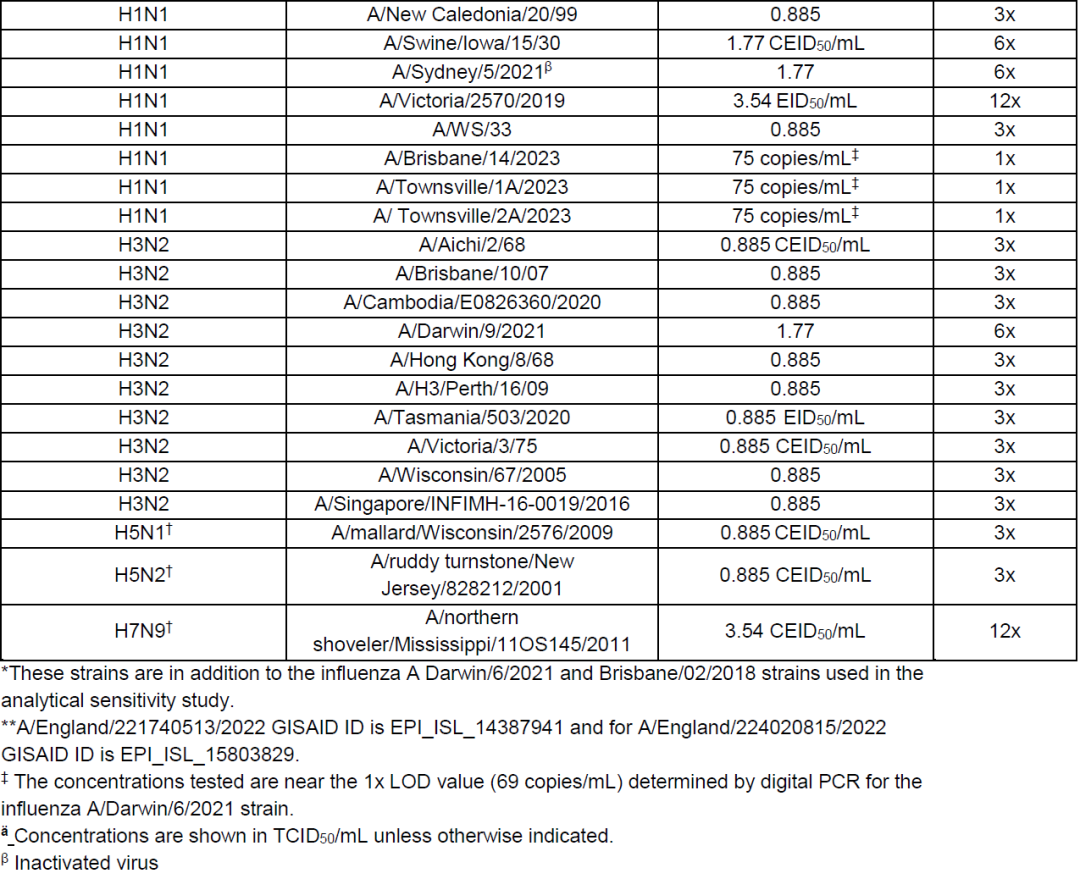 如SARS-CoV-2的USA - WA1/2020菌株LoD浓度为0.0350 TCID50/mL,阳性率为20/21(35.5);甲流的Darwin/6/2021菌株LoD浓度为0.295 TCID50/mL,阳性率为21/21(35.0)等。