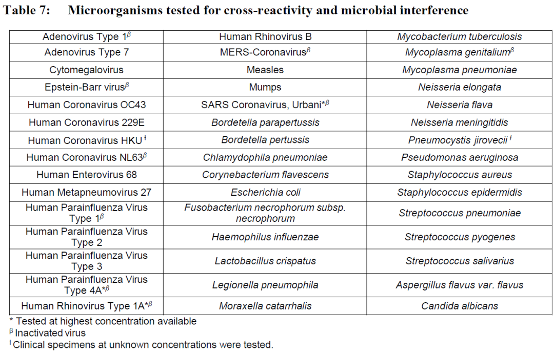 所有测试的微生物在测试浓度下均未与cobas liat® SARS-CoV-2, Influenza A/B& RSV核酸测试发生交叉反应或干扰。