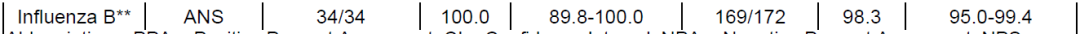 对于ANS标本,对SARS-CoV-2的PPA和NPA分别为96.7%和97.2%;对甲流的PPA和NPA分别为100.0%和99.3%;对乙流的PPA和NPA分别为100.0%和99.5%;对RSV的PPA和NPA分别为97.5%和98.8%。