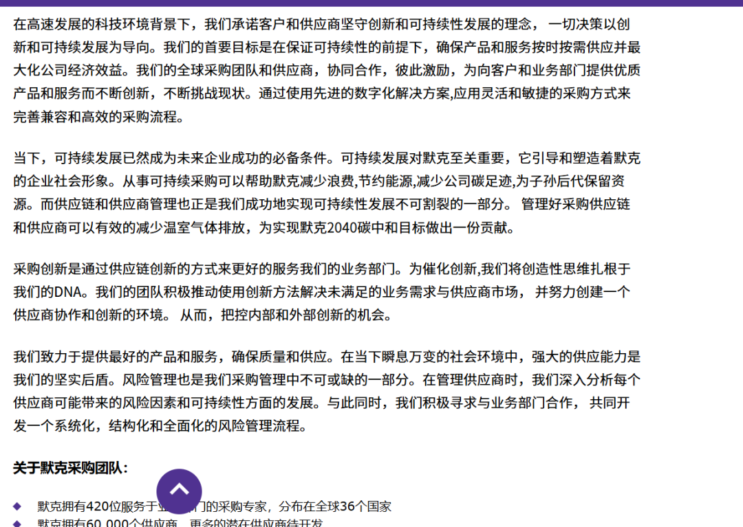 | 默克采购把创新放到了第一位。创新能够让企业更有内驱力,让内部需求有更多更好的选择。 认为创新是研发的事情或者生产质检的事情,和采购基本没关系,让你干啥就干啥,你就下单就好了。那你们公司的采购不是采购是下单员,至少没有一个人是采购经理水平的。采购部参与创新,企业的全链条创新才会使企业更加流畅更多选择更公平。最基本的我当年选择助手要求必须是从研发或者生产部门选择,不外聘,这是基于对产品对体系的考虑,只有这样才能有基础进行创新。 研发创新过程给采购反馈信息太慢或者根本不给。我和发光五虎中三位采购经理沟通过,这样的大企业也多少存在这样的问题,不催不反馈,另外反馈数据很薄弱。其实,如同默克采购理念里面提到的,要和供应商创造一个协作创新的环境,你做的结果不好,可能是对某产品的使用还没有到位造成的,人无完人,你敢说你自己全过程都很完美么?另外,供应商见过很多客户反馈的数据,见过很多问题,也许会提出一些建议,它山之石可以攻玉的道理不用赘述吧。 我其实对这个问题做过思考,结合默克采购理念中提到的数字化说说我的一点看法。 现在采购普遍问题是啥,就是平时积累不注意或者做得不够,但是也没人关注,只是在寻源的时候才想起来,大海捞针找吧。那么为什么不利用网站等工具进行革命更新呢? 网站展示了怎么卖 东西,怎么下单,怎么查COA,怎么技术咨询等,但是网站展示怎么成为默克供应商了么?我觉得不管是默克还是国内其他企业,应该想到你既要卖东西,还要买东西的。卖东西有橱窗,为什么买东西不设置橱窗呢?(橱窗只是比喻) 设置了橱窗,可以让供应商上传商品,要设定必须填写的项目比如说明书、近几个批次检验报告和厂房设施等情况。简单地说,要有企业情况的说明部分,还要有产品的详细介绍,还可以增加产品主要应用方向,这样会让搜索更精准一些。 另外,默克的采购管理引入了风险管理理念,这也是很多企业做不到的。 其实供应链风险很多企业都遇到过,尤其是疫情期间,我那时经常看到夜里一两点还在群里找货的采购经理在交流信息,关键还不是一个人是一群人。大家都谈这个难那个难,但是给我的普遍感受是以前没想过没准备没备份供应商。 单单从运输角度考虑,我在以前供职公司分析了一个二季度到货不准的专题,经过大量调研,发现这个期间不管是台风还是旅游旺季,那个时期经常出现柴油短缺的问题,但是大宗货物都是柴油车运输的,因此我就提出了相应的管理预案,进行了很好的疏导。 默克采购致力于提供最好的产品,确保质量和服务,没强调价格没强调年降本率,可是这个指标往往是各个企业对采购经理考核的重要指标之一。供应商一点利润都没有,那他还会坚持么还有动力么? 默克采购还提到了碳中和的目标,其实可以稍微解释一下,一个是对企业的正面宣传,另外一个也让供应商知道从哪些地方也要进行改变或者创新才好。