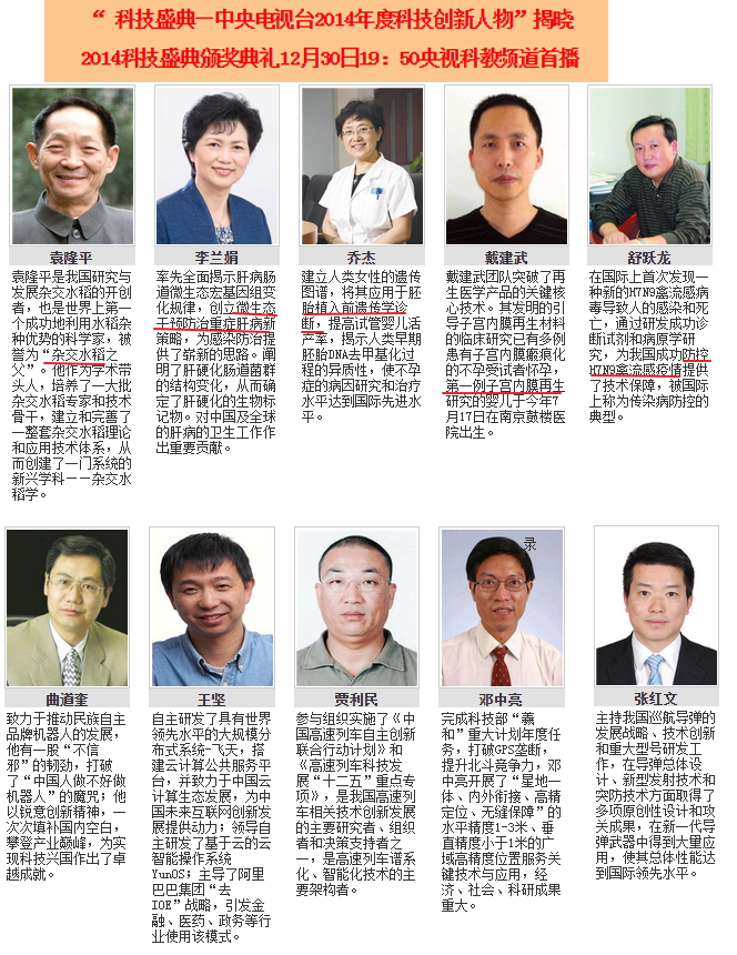 在这充满机遇和变革的2014年里,中国的科技工作者勇攀科学高峰,打开了一扇扇机遇之窗:从病毒拆解到智能革命,从蔚蓝地球到遥远星际,他们以产业升级抢占市场先机,以核心技术维护国家安全;在中国古老的土地上,他们让稻花之香洒满世界;在晶体管和芯片的赛场上,他们连续跑出世界第一;无数的科研人员,用他们的不懈探索,多学科,多领域地提升着国家科技的整体实力,用他们最前沿的科研成果,引领着我国经济从资源拉动向创新驱动转变,推动着产业发展从劳动密集比较优势向科技创新比较优势转变。 《科技盛典》序 科技盛典是中央电视台继“感动中国”、“中国年度经济人物”、“体坛风云人物”之后,围绕科技宣传主题,全力打造的国家级年度科技盛宴。节目以“科学界的盛事、科学家的盛会”为策划思路,盘点年度科技成果,展示我国科技事业的重大进展与成就,宣传优秀科技工作者和团队典型,弘扬科学成就和广大科技工作者的创新精神。 2014年度10大科技创新人物获奖名单 “中央电视台2014年度科技创新人物推选活动”评选结果12月24日揭晓。经过三轮评审,活动推选委员会从84名有效候选人物(含个人和团队)中,评选出2014年度十大“科技创新人物”和三大“科技创新团队”。其中,在入选当选2014年度最具影响力的10大“科技创新人物”,生命科学领域有5人入选。