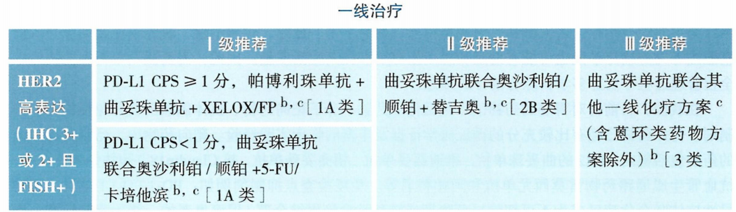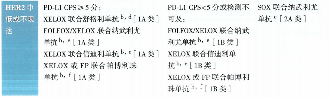 HER2中低或不表达免疫治疗:在HER2中低或不表达时,优先建议进行PD-L1检测,在CPS≥5时,CSCO指南推荐选择免疫联合化疗的治疗方案进行治疗。