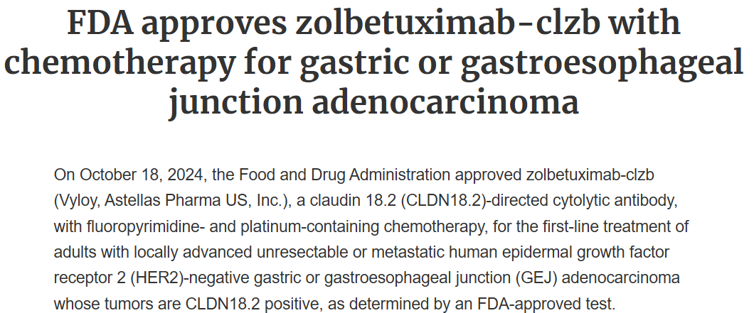 2010年,FDA批准曲妥珠单抗联合化疗用于HER2阳性转移性胃癌的一线治疗,开启了胃癌精准治疗的新篇章,随后十多年,围绕HER2阳性、PD-L1表达的研究陆续出现积极的结果,纷纷获批;2024年,FDA&NMPA批准佐妥昔单抗用于联合化疗用于CLDN18.2阳性、人表皮生长因子受体2(HER2)阴性的局部晚期不可切除或转移性胃或胃食管交界处(GEJ)腺癌患者的一线治疗,将胃癌精准治疗推上了新的高度。