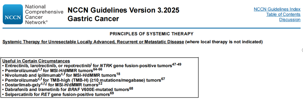 泛靶点治疗:除了上述基因检测外,越来越多的泛靶点药物被获批,因此相应的泛靶点标志物也被NCCN/CSCO指南纳入到胃癌的基因检测中,如针对NTRK融合的拉罗替尼、恩曲替尼、瑞普替尼、针对 TMB-H 的帕博丽珠单抗、针对BRAF V600E 突变的达拉非尼联合曲美替尼以及针对RET融合的赛普替尼。