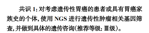 因此,胃癌高通量测序临床应用中国专家共识对考虑遗传性胃癌的患者或具有胃癌家族史的个体,推荐使用 NGS 进行遗传性肿瘤相关基因筛查,并做到具体的遗传咨询。