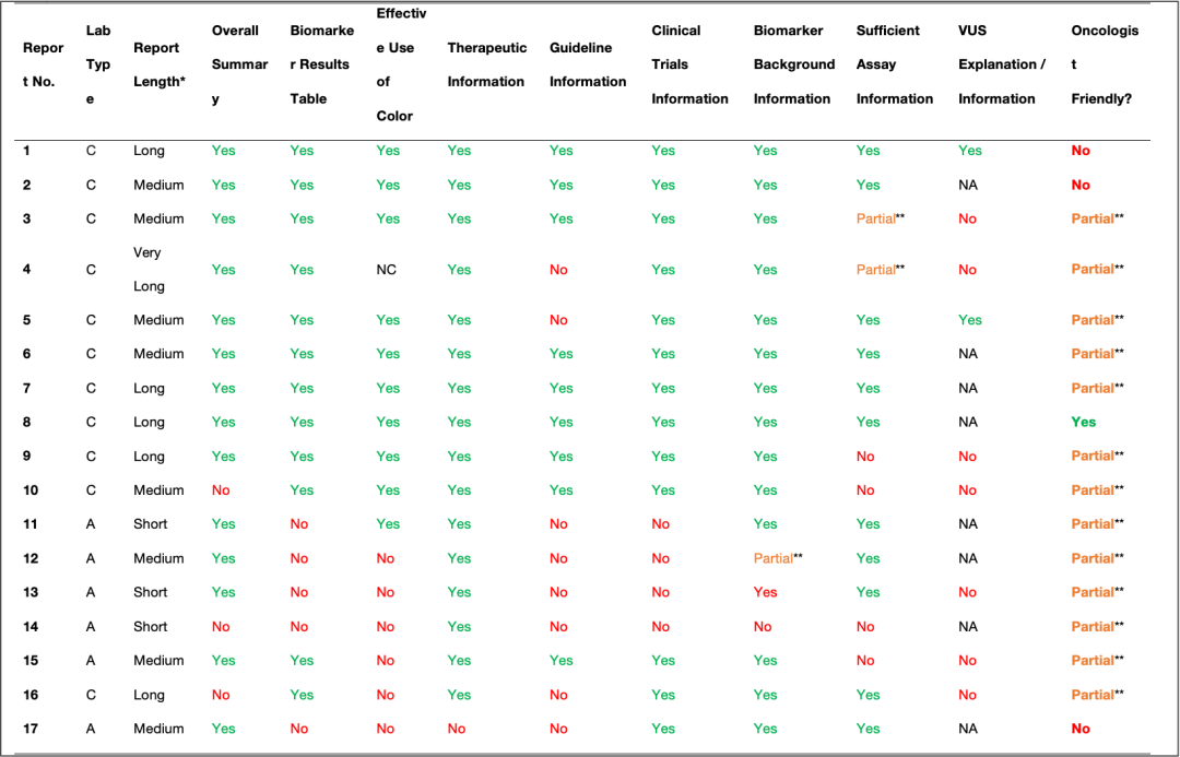 这是一件非常重要的工作,建议国内各肿瘤NGS企业同行们、协会们参考。 众所周知,肿瘤NGS检测,日益成为肿瘤伴随诊断、预后评估、复发监测的重要手段。但在实际推广中,存在一个现实问题: 各家的报告模板千差万别。 有的报告信息缺失、信息冗余、结构混乱、呈现上也很不友好,这导至医生们难以快速抓取关键信息,发生误判、延误治疗,同时也制约了肿瘤NGS的普及。 类似的问题,同样也发生在美国。 因此,美国分子病理学协会(AMP)专门组建了一个跨学科专家小组,小组成员包括有丰富经验的分子实验室专家、分子病理学家、病理学家以及肿瘤医生,他们的任务只有一个: 制定一份符合指南的、对临床医生更友好的肿瘤NGS报告模板。 通过制定统一的报告模板,提升报告的可读性和易理解性,这不仅有助于推动NGS技术的应用与普及,还能提升报告的编写效率,从而让检测机构、医生、患者都能从中受益。 为此,该专家组审阅了17家实验室的NSCLC生物标志物检测报告,并进行多方面评估。尽管17份报告都包含了一些关键要素,但专家组一致认为,这17家实验室的报告中,只有1份报告真正符合肿瘤科医生的需求。 报告中,不足的地方,包括: 长度与结构:报告冗长、格式不统一、结构混乱。 信息呈现:关键信息(如可靶向的治疗)不突出,重要信息(如阴性结果)可能被忽略,冗余信息较多。 兼容性与可读性:PDF格式不利于电子健康记录(EHR)集成与数据挖掘,传真后格式、色彩易失真。初步报告/修订报告流程繁琐耗时。 标准化问题:各实验室报告格式差异大,虽然AMP/ASCO/CAP体细胞变异解读指南已被广泛接受(84.9%的NGS实验室使用),报告格式仍未统一。 合规要求:报告需满足支付方(如CMS国家覆盖决定)、监管机构(CLIA, FDA)的特定要求才能获得报销。