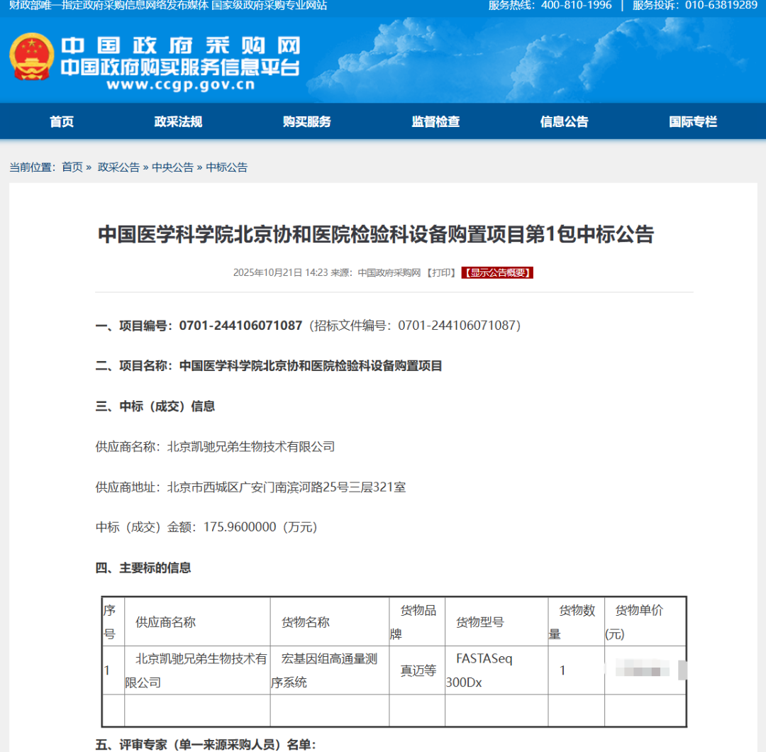 贝瑞和康代理赛陆测序仪中标协和医院检验科项目,还有真迈测序仪,越来越有趣了