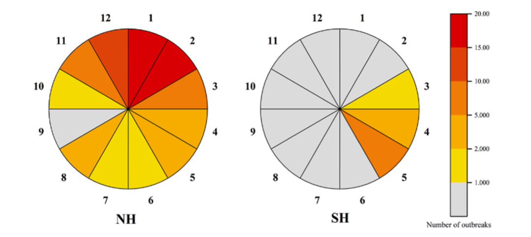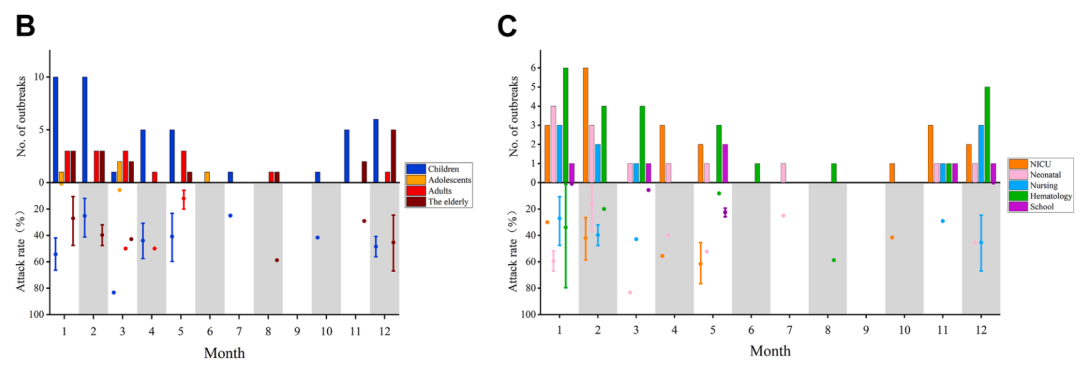 呼吸道合胞病毒(RSV)作为急性下呼吸道感染的重要病原,可累及全年龄段人群,对全球公共卫生构成沉重负担。近期《柳叶刀》子刊《EClinicalMedicine》发表覆盖六大洲、跨度逾60年的RSV流行病学荟萃分析,对比不同地区、亚群、季节、年龄及RSV基因型的疫情趋势,为全球RSV疫情的流行病学与临床研究提供重要参考。 主要研究结果速览 PART 01 01 全球RSV疫情整体特征 ●RSV疫情增加: 研究共纳入72篇文献的82起RSV疫情暴发事件,累计2282例病例。随时间推移,RSV疫情暴发总体走高,尤其是近二十年间增加显著,2019年达峰值(6 起)。 图1.1960-2025年全球报告的RSV疫情暴发的时间模式 ●RSV疫情发生区域: 全球有25国报告RSV疫情,以美国(23例)、英国(12例)、中国(9例)次数最多;其余国家分别为巴西、德国、日本、土耳其、保加利亚、法国、韩国、澳大利亚、葡萄牙、科威特、印度等。按WHO区域划分,欧洲和美洲区域发生率最高(36.59%)。 图2. 全球RSV疫情相关研究的地理分布 注释:A.地理分布 C.WHO区域占比 ●患者年龄分布: RSV疫情主要集中在儿童群体,占比52.44%,其次为老年人(20.73%), 成年人(18.29%)和青少年群体(6.10%)。所有年龄段中,2岁组的暴发次数最少,仅2.44%。 ●季节分布: 64.63%的RSV疫情发生在冬季, 其次是春季(17.07%)、 秋季(13.41%)和夏季(4.88%)。具体而言,北半球RSV疫情主要集中在12月至次年2月,而南半球则多发于3月至5月。 图3. 全球RSV疫情相关研究的地月度分布情况 ●高发场所: 血液科/肿瘤中心暴发25起,数量最高,占比30.49%,其次为新生儿重症监护室(24.39%)、新生儿病房及护理机构(15.85%)、养老院(12.20%)、学校(7.32%)、军营(1.22%)及其他场所(包括空军新兵训练营、普通成人病房和普通儿科病房)(8.54%)。 ●RSV基因型差异: RSV-B是最常报告的亚型,占比46.88%,其次为RSV-A(28.13%),混合型RSV-A/B占比25%。 02 RSV疫情的罹患率(attack rate) 在报告罹患率的41起疫情中,其汇总估计值为35.78% (95% CI:29.16–42.67)。儿童相关疫情暴发(42.29%,95%CI:34.53–50.23) 新生儿病房 (44.67%,95%CI:31.76–57.92)和RSV-B基因型研究(46.95%,95%CI:35.20–58.87)比例更高。 图4:不同年龄和环境条件下RSV暴发与月度发病率的变化趋势 注释:B.不同年龄组发病率;C.不同环境条件发病率 03 RSV疫情规模 82起疫情的中位规模13例。RSV-B更易在儿童感染,而RSV-A/B混合感染在老年人中病例更多。青少年和成人疫情较少,但易在人口密集场所如学校和军营爆发大规模疫情。 图5:全球RSV疫情暴发事件数量及病例数按年龄、地区和RSV基因型分类对比 注释:A.不同基因型疫情分布;B.不同地区疫情分布;C.不同年龄疫情规模;D.不同地区疫情规模 04 RSV感染的临床表现 咳嗽最常见(75.69%),其次是发热(53.87%)、流涕(36.89%)和鼻塞 (14.29%)。 ●年龄差异:咳嗽为幼儿和老年人的主要症状,青少年和成人中发热更常见。 幼儿也常见呼吸困难(9.28%); ●基因型差异:RSV-A感染更多表现为咳嗽、 发热和流鼻涕;RSV-B感染则常与鼻塞和喘息相关,发热的患病率明显低。RSV-A/B混合感染症状介于两者之间。 图6:1960至2025年RSV全球疫情按年龄、病毒基因型划分的临床表现与病死率分布 注释:左.按年龄组划分的临床表现;右.按基因型划分的临床表现 05 RSV疫情的病死率(CFR) 绝大多数患者完全康复,仅117例死亡, 合并病例死亡率(CFR)2.77%(95%CI:1.01–5.10)。CFR随时间递减,从1970年前的3.15%降至2020年后的1.24%。 ●年龄差异:老年人死亡人数最多,病死率9.24%(95% CI:2.75–18.07); ●场所差异: 血液科/肿瘤中心病死率最高(7.56%,95% CI:2.56–14.15),其次为养老院和新生儿重症监护室; ●基因型差异: RSV-A/B混合感染病死率最高,达6.31%(95% CI:0.02-18),单独RSV-A亚型次之,单纯RSV-B病毒引发的疫情病死率最低。 图7:1960至2025年RSV全球疫情按年龄、场所及病毒基因型划分的病死率 研究结论 PART 02 自1960年代起,RSV暴发已使全球疾病负担持续攀升,报告事件逐年递增。尽管总体病死率下降,但在老年人、RSV-A/B混合感染及血液肿瘤中心等亚群中仍居高。研究提示应建立更灵敏的监测与快速响应机制,并制定针对高危人群的精准预防策略,方能更好遏制RSV的全球蔓延。 参考文献:Duan Q, Pan J, Zheng L, et al. Global outbreaks of respiratory syncytial virus infections from 1960 to 2025: a systematic review and meta-analysis. EClinicalMedicine. 2025 Jul 10;86:103352. doi: 10.1016/j.eclinm.2025.103352. |