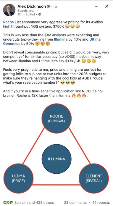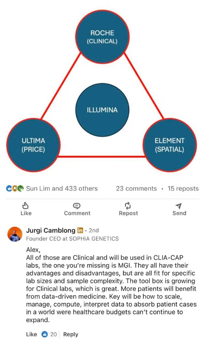 这不,SOPHiA GENETICSCEO Jurgi Camblong直接在Alex Dickinson在领英发布的观点中评论指出,当前测序平台的PK不应该漏提 MGI