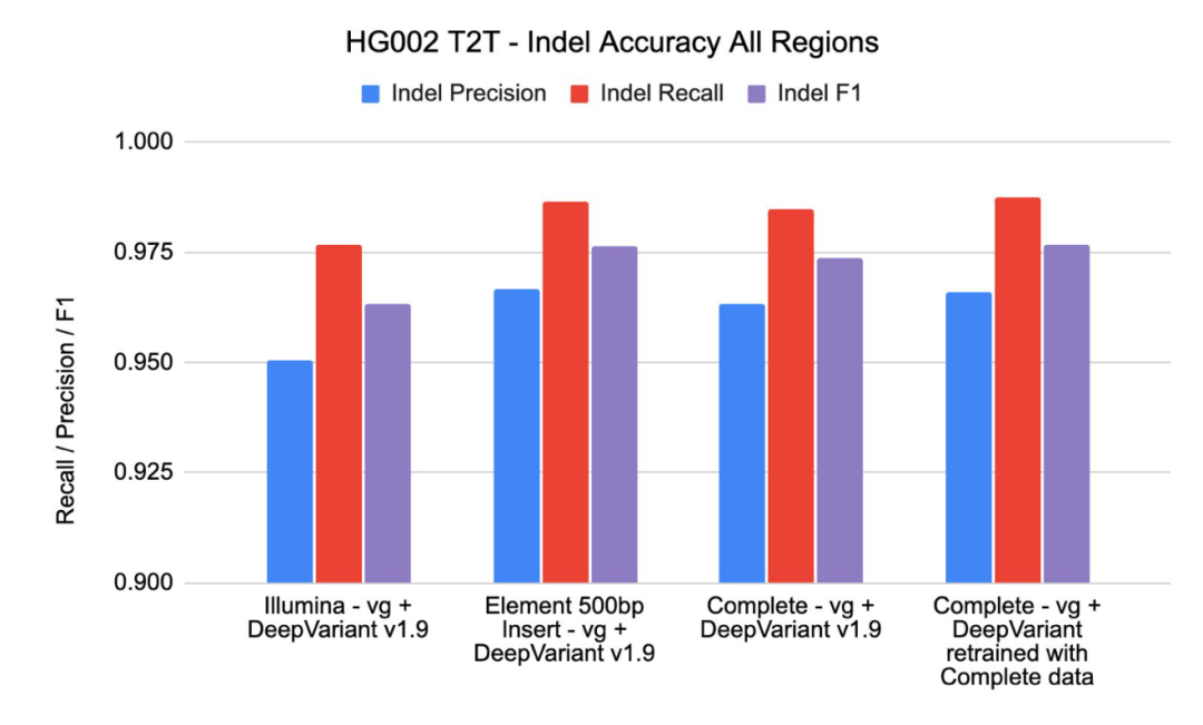 在过往的开发实践中,DeepVariant针对新的如ElementUltima等平台产出的数据都进行了专项优化,这显著提升了准确性,确保了模型跨平台及在不同样本中的鲁棒性和泛化能力。例如,针对Element数据训练所产生的泛基因组感知DeepVariant v1.9实现了对于Novaseq +DRAGEN v4.3精度的超越。