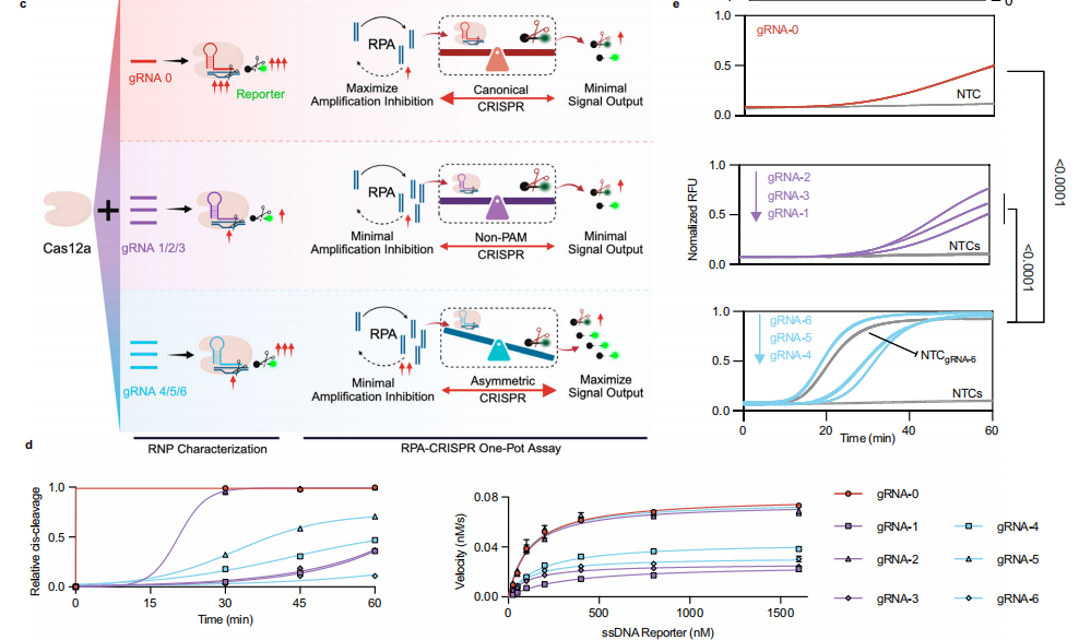 在经典RPA-CRISPR体系中,RPA产生的ssDNA/dsDNA产物既能促进Cas12a活化、也可能因被cis裂解而降低扩增效率。作者系统比较了7条gRNA组成的Cas12a RNP在体外的cis与trans活性。结果显示,gRNA-2、-5具有非对称裂解活性,cis裂解活性降低,但在trans活性上与标准gRNA相当(图d)。这种不对称活性使反应动力学更好(图e),减少了扩增子的裂解,从而提高了扩增效率、Cas12a反式裂解动力学和检测信号(图c)