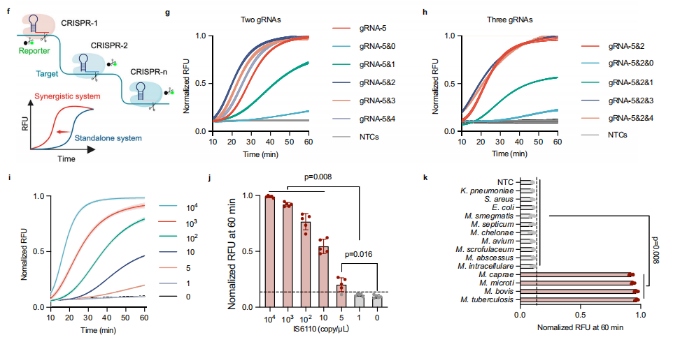 在总gRNA浓度恒定下,联用多种gRNA可调节反应动力学。结果显示,优化的ActCRISPR-TB gRNA-5实验中添加其他gRNA会显著增加(gRNA-2 > gRNA-3 > gRNA-4)或降低(gRNA-0 >> gRNA-1)其动力学(图g)。最佳三联组合(gRNA-2/-3/-5)的Multi-gRNA ActCRISPR-TB将单管法的检测限优化到5 copies/µL,比使用标准gRNA的检测低20倍,同时还能保持对结核分枝杆菌复合群的种属特异性(图k)