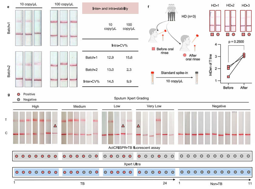 舌拭子样本因无创、易自采,被认为是实现社区广域筛查的关键。作者比较了ActCRISPR-TB与Xpert Ultra在205份舌拭子样本上的表现,结果显示,ActCRISPR-TB敏感性74%,优于Xpert Ultra的56%,两者对53例非TB样本特异性均为100%(图b)。ActCRISPR-TB还检出相当比例由痰涂片或Xpert漏检的病例。