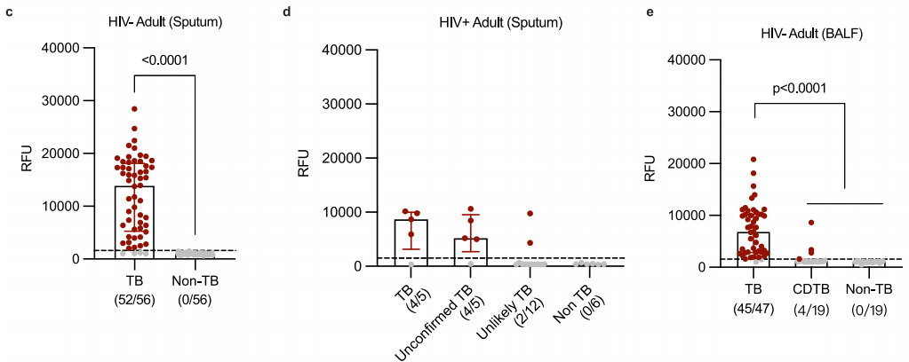 在支气管肺泡灌洗液(BALF)样本中,ActCRISPR-TB检出47例细菌学确诊TB中的96%,对临床诊断TB(非细菌学证实)检出21%,对非TB为100%阴性(图e。在呼吸道样本(含痰+BALF)中,与Xpert总体一致性达93%,合并敏感性94%、特异性92%。在儿童粪便样本中,ActCRISPR-TB对粪便样本的敏感性83%、特异性94%。作者还对其诊断肺外结核(EPTB)的能力进行了评估。在疑似结核性脑膜炎成人队列中,ActCRISPR-TB对细菌学确诊TBM的检出率达93%,对临床诊断TBM为64%,总体敏感性明显高于Xpert(约35%)。