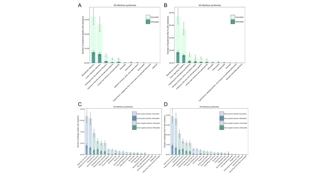在综合征层面,排名前三的依次为血流感染、下呼吸道感染和腹腔感染,占AMR总死亡的90.4%(图2A),DALYs的84.9%(图2B)