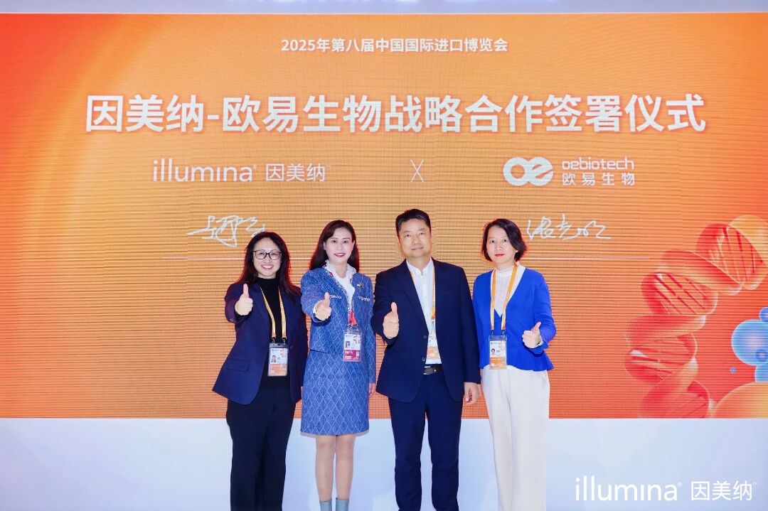 2025年11月6日,因美纳(中国)科学器材有限公司(以下简称“因美纳”)与上海欧易生物医学科技有限公司(以下简称“欧易生物”)在第八届中国国际进口博览会(以下简称“进博会”)举行因美纳-欧易生物战略合作签署仪式。 因美纳全球高级副总裁兼大中华区总经理郑磊女士、大中华区商业与战略发展负责人兼大中华区市场部负责人赵英女士、南中国科研销售总监舒晓莉女士,与欧易生物总经理张志明先生共同出席仪式并合影留念。 (图中由左至右依次为因美纳大中华区商业与战 略发展负责人兼大中华区市场部负责人赵英女士、因美纳全球高级副总裁兼大中华区总经理郑磊女士、欧易生物总经理张志明先生、因美纳南中国科研销售总监舒晓莉女士) 本次合作的核心是于2025年9月全球发布的Illumina® Protein Prep(IPP)蛋白组学解决方案。该平台拥有大规模的检测能力、结果高度的一致性以及简便的工作流程,将为科研人员提供深入的蛋白质生物学洞察,对揭示罕见肿瘤免疫治疗耐药机制、挖掘新型生物标志物具有关键价值。因美纳与欧易生物的战略合作,将推动IPP基于测序的蛋白组学解决方案在中国落地与多场景应用整合。 欧易生物总经理张志明表示:“依托因美纳IPP(SomaSeq)技术,结合欧易在本地化的服务优势,大量的科研用户与多组学应用场景挖掘的经验,能更好将创新的测序蛋白组学与高通量测序技术,融合到实际研究中。我们期待通过此次合作,助力中国科研团队更好探究疾病机制,加快生物标志物发现与创新药物开发。” 在进博会这一高水平开放平台的见证下,因美纳与欧易生物完成签约并合影留念。双方表示,未来将继续携手并进,深化在蛋白质组学科研领域的合作,共同探索更多创新可能性,为解码生命奥秘、守护人民健康做出卓越贡献,为人类健康事业谱写新的辉煌篇章。 关于因美纳: 因美纳公司致力于推动和激发基因组学的发展而不断改善人类健康。专注创新使我们成为全球基因测序和芯片技术的领导者,并为全球范围的科研、临床和应用市场客户提供专业服务。我们的产品广泛应用于生命科学、肿瘤学、生殖保健、农业及其他新兴领域。 关于欧易: 欧易生物是一家致力于为生命科学研究提供多组学技术的研究服务机构,产品涵盖单细胞及时空多组学、基因组学、转录组学、表观组学、蛋白组学、代谢组学、生物信息学以及临床诊断产品开发,秉承“以生物科技, 成就他人, 造福大众”的企业使命,用技术改变生活,用科技造福人类。 |