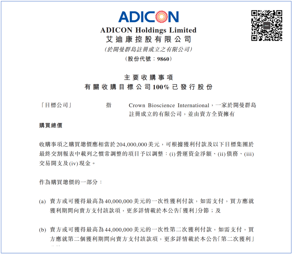 2025年11月13日,香港上市公司艾迪康宣布收购冠科生物(Crown Biosience International),总对价2.04亿美元,收购预计2026年完成。