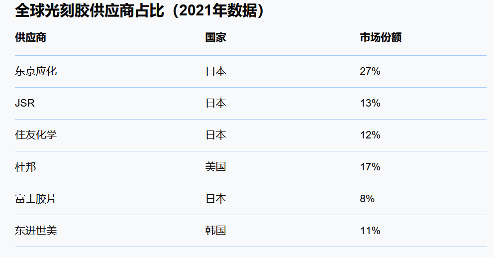 根据2021年的数据,JSR光刻胶市场份额约为13%,全球排名第三。