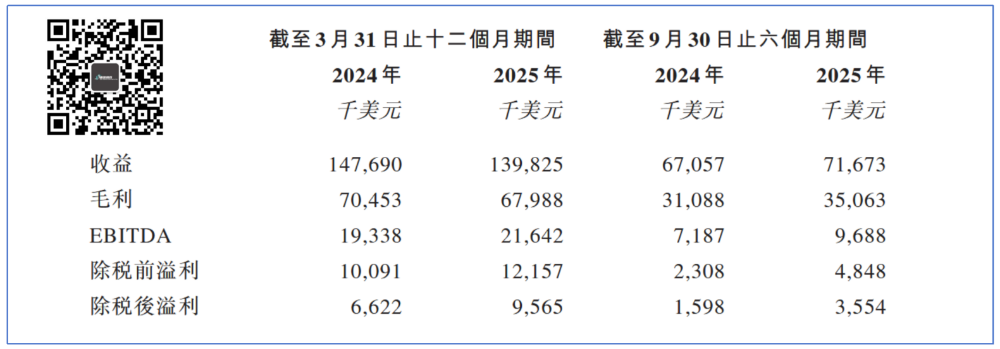 从披露的信息可以看到,截至2024年3月31日前12个月EBITDA是1933.8万美元,同时间段2025年的数据是2164.2万美元。