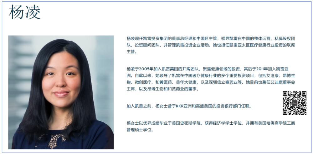 董事长杨凌女士也同样是凯雷亚洲医疗业务的主管,她领导了凯雷在中国的艾迪康、昂博生物、微创医疗、和黄医药、美年大健康,以及深圳信立泰药业等项目。