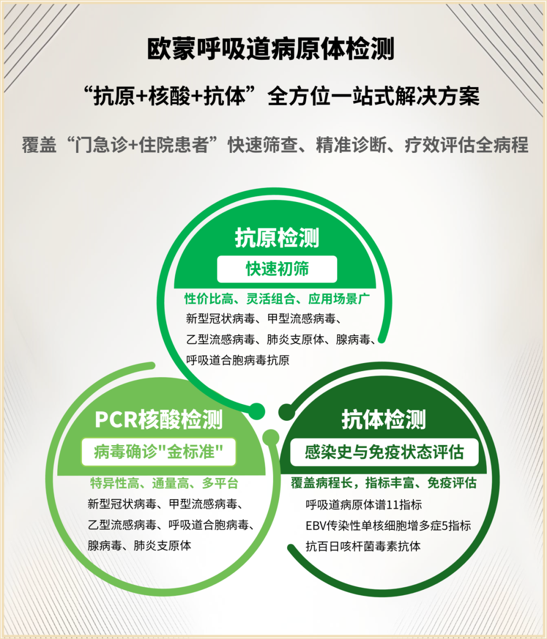 欧蒙医学诊断(中国)有限公司作为深耕中国体外诊断市场多年的领军企业,在自身免疫性疾病、感染性疾病、变态反应性疾病诊断、抗原检测以及分子诊断领域拥有领先的技术,拥有覆盖全国各级医院、疾控中心及第三方检验机构的成熟营销网络与专业的市场服务团队。凭借对临床需求的深刻理解和卓越的市场拓展能力,欧蒙持续将国际前沿诊断产品成功引入中国市场,并获得了行业与客户的广泛认可,奠定了欧蒙在体外诊断领域稳固的市场地位和领先的品牌影响力,为新业务拓展提供坚实支撑。