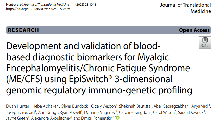 前言 肌痛性脑脊髓炎/慢性疲劳综合征(ME/CFS)是一种以严重疲劳、劳累后不适、认知障碍和自主神经功能紊乱为特征的多因素致残性疾病,全球有数百万人受其影响。尽管该疾病对生活质量造成显著影响,但目前仍缺乏明确的诊断生物标志物,导至临床诊断和管理面临巨大困难。 近日,杂志Journal of Translational Medicine上发表了一篇题为“Development and validation of bloodbased diagnostic biomarkers for Myalgic Encephalomyelitis/Chronic Fatigue Syndrome (ME/CFS) using EpiSwitch® 3-dimensional genomic regulatory immuno-genetic profiling”的文章。作者为东英吉利大学与牛津生物动力学公司。本研究基于EpiSwitch®三维基因组调控免疫遗传分析技术,通过全基因组染色体构象(CCs)筛选,确定了一个200个标记的ME/CFS诊断模型(Episwitch®CFS测试),灵敏度为92%,特异性为98%。通路分析揭示了几个可能导至ME/CFS病理的因素,包括白细胞介素、TNFα、神经炎症通路、toll样受体信号传导和JAK/STAT。与利妥昔单抗和醋酸格拉替雷(Copaxone)(具有ME/CFS治疗潜力的疗法)作用的途径进行比较,发现IL2是具有明确患者聚类的共享途径,表明可能存在靶向治疗的潜在应答组。 图片来源:Journal of Translational Medicine 主要内容 研究概述 表观遗传变化是炎症和代谢过程的调节因子。作者使用了一种新的表观遗传检测(EpiSwitch®Explorer assay),可以同时筛选循环血细胞中的106种3D染色体构象(CC)。 本研究采用回顾性病例对照设计(EPI-ME),纳入47名重度ME/CFS患者和61名健康对照者。通过EpiSwitch® Explorer阵列平台对全血样本进行全基因组3D DNA筛查。通过机器学习算法对训练集进行特征筛选,最终确定200个标志物构成ME/CFS诊断模型(Episwitch®CFS测试)。 诊断性能与生物标志物特征 在独立验证队列中,Episwitch®CFS测试显示出优异的诊断性能(如下图):灵敏度达92%,特异性达98%,总体准确率为96%。阳性似然比为41.25,疾病预测阳性值和阴性预测值均达到95.65%。这些CC标志物广泛分布于多个染色体区域,表明ME/CFS可能涉及基因组区域的复杂相互作用,而不是单一的失调位点。 测试性能评估与诊断准确性。 图片来源:Journal of Translational Medicine 基因组映射与标志物分布特征 作者将EpiSwitch®全基因组筛选的前200个预测性3D基因组标记映射到最近的基因,发现这些标志物广泛分布于多个染色体区域,表明这些区域可能包含与ME/CFS病理机制相关的关键基因组位点。这种分布模式反映了ME/CFS的多基因特征,而非单一基因座失调(如下图)。 排名前200个CC标记的全基因组定位。图片来源:Journal of Translational Medicine 通路分析与免疫机制解析 作者还通过STRING蛋白互作网络和Reactome/MSigDB通路富集分析,发现ME/CFS患者存在显著的免疫和炎症信号通路异常,与ME/CFS中的免疫失调信号一致(如下图)。主要包括:白细胞介素信号传导(IL-2、IL-10及其相关级联)、TNF/NF-κB信号轴、Toll样受体(TLR)信号通路以及JAK/STAT信号通路。 IL-2在STRING子网络中作为中心枢纽,与IL-2信号传导和T细胞调节模块紧密相互作用。 蛋白相互作用网络和信号转导通路分析。图片来源:Journal of Translational Medicine 治疗网络的重叠 先前的研究表明,有部分ME/CFS患者亚群对利妥昔单抗(Rituximab)和格拉替雷(Copaxone)反应良好。比较分析显示,ME/CFS表观遗传特征与利妥昔单抗和格拉替雷的治疗网络存在显著重叠,三个网络共享的关键分子节点包括IL-2、IL-10和CD4,表明这些免疫调节剂可能通过共同通路发挥作用(如下图)。 从ME/CFS结果中,作者选择了与50个IL2 STRING基因/蛋白相关的最重要的CC。基于IL-2相关CC标志物的聚类分析显示,47名ME/CFS患者中呈现出明显的18/29例分层模式。这种基于IL-2表观遗传特征的清晰分层表明,IL-2相关标志物可能作为患者亚组分层的生物标志物,为精准治疗提供依据。 ME/CFS、利妥昔单抗和格拉替雷之间的通路重叠。图片来源:Journal of Translational Medicine 潜在治疗策略的识别 作者通过文献分析筛选出12种可能同时降低IL-2和CD4+细胞并增加IL-10的潜在疗法。这些疗法包括:利妥昔单抗(通过B细胞耗竭间接抑制IL-2)、格拉替雷(通过向Th2/调节表型转变免疫特征)、雷帕霉素(通过mTOR抑制阻断IL-2介导的T细胞增殖)、托法替尼(JAK抑制剂,阻断IL-2信号传导)等(如下表)。尽管并非所有 12 种疗法都已在ME/CFS中进行过试验,但其中许多疗法的作用机制与观察到的免疫功能障碍相吻合。未来的研究应侧重于低剂量、精准的免疫调节,并密切关注免疫监测、感染风险以及亚组分层。 潜在治疗策略的识别。图片来源:Journal of Translational Medicine 总结与未来方向 本研究基于EpiSwitch®三维基因组调控免疫遗传分析技术,通过全基因组染色体构象(CCs)筛选,确定了一个200个标记的ME/CFS诊断模型(Episwitch®CFS测试),灵敏度为92%,特异性为98%。通路分析揭示了几个可能导至ME/CFS病理的因素,包括白细胞介素、TNFα、神经炎症通路、toll样受体信号传导和JAK/STAT。与利妥昔单抗和醋酸格拉替雷(Copaxone)(具有ME/CFS治疗潜力的疗法)作用的途径进行比较,发现IL2是具有明确患者聚类的共享途径,表明可能存在靶向治疗的潜在应答组。 尽管本研究取得了显著成果,但仍存在一定局限:首先,研究队列仅限于重度卧床患者,结果是否适用于轻中度患者尚需验证;其次,该方法对其他慢性炎症性疾病的表现尚未得到测试;最后,表观遗传改变可能是慢性免疫激活的下游结果,其因果性需