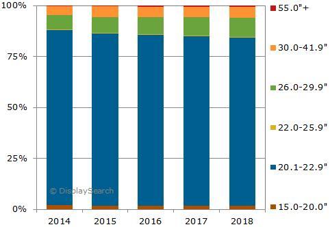 IHS DisplaySearch最新出版的专业显示器报告显示,2014到2018年间,医疗影像诊断显示器(diagnostic displays)全球出货量复合年均增长率(CAGR)预计将达5%。虽然更大尺寸、更高分辨率及更高屏幕高宽比(wide-aspect-ratio)的显示器开始越来越受欢迎,但2014上半年,21.3”显示器的出货量仍占总出货量的67%,营收则占到65%。由于医疗影像诊断显示器使用之偏好,21.3”的高分辨率显示器持续成为主流。 IHS DisplaySearch专业及商用显示器高级分析师Todd Fender表示:“由于发达地区需求已近饱和,医疗影像诊断显示器未来大部分的增长将出现在新兴地区。具体到国家而言,显示器品牌厂商已将中国定为最具增长潜力的国家,紧随其后的是拉丁美洲。” 图一、2014-2018年,各尺寸医疗影像诊断显示器全球出货量预测