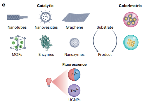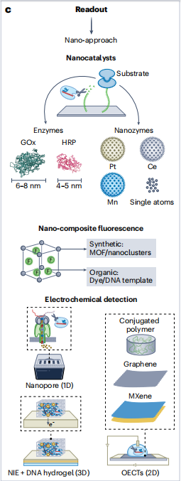 酶催化系统已广泛运用在信号读出系统,比如辣根过氧化物酶(HRP)与葡萄糖氧化酶(GOx),但它们在长期稳定性、可扩展性和成本方面存在局限性。合成的纳米分子可提供一种替代方案。纳米酶是一类基于金属或金属氧化物的纳米粒子,它们具备生物酶的功能,同时保留了合成纳米粒子的通用性和稳定性。比如,铂核壳纳米颗粒(CrisprZyme系统)可替代天然酶,在比色检测中实现临床相关灵敏度,且无需使用荧光信号。
