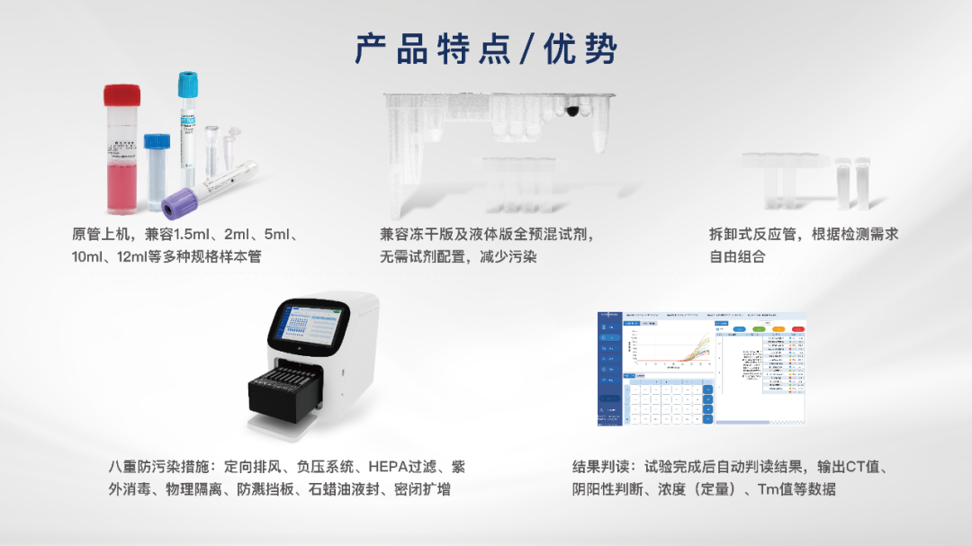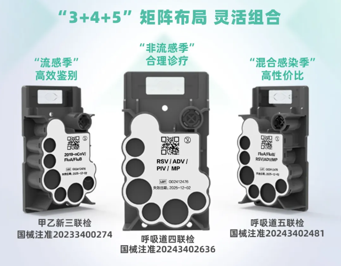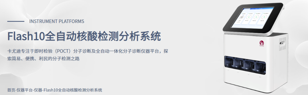 检测数量:5项 注册人:北京京东方知微生物科技有限公司 技术原理:荧光PCR法 检测靶标:甲型流感病毒、乙型流感病毒、呼吸道合胞病毒、腺病毒、肺炎支原体的核酸 样本类型:咽拭子 检测时间:<30min 注册证号:国械注准20243402481 注册时间:2024 试剂有效期:2℃~28℃避光干燥保存,有效期12个月。 (9)卡尤迪生物-呼吸道分子POCT快检方案 新型冠状病毒2019-nCoV和甲型乙型流感病毒核酸检测试剂盒(荧光PCR法) 检测数量:3项 注册人:卡尤迪生物科技宜兴有限公司 技术原理:荧光PCR法 检测靶标:新型冠状病毒(2019-nCoV)ORF1ab、N基因及甲型、乙型流感病毒(FluA、FluB) 样本类型:咽拭子 检测时间:<30min 注册证号:国械注准20233400584 注册时间:2023 试剂有效期:检测盒于2~28℃避光保存,质控品于2~8℃保存,有效期12个月。 甲型/乙型流感及呼吸道合胞病毒核酸联合检测试剂盒(实时荧光PCR法)Xpert Xpress Flu/RSV Assay 检测数量:3项 注册人:赛沛公司Cepheid 技术原理:荧光PCR法 检测靶标:甲型流感病毒/乙型流感病毒/呼吸道合胞病毒 样本类型:鼻咽拭子 检测时间:<30min 注册证号:国械注进20193400413 注册时间:2019年 试剂有效期:2~28℃储存,有效期为24个月 |