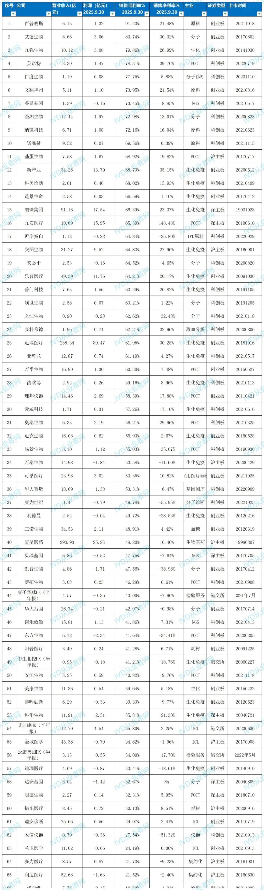 IVD上市企业毛利率排行来了(附名单)