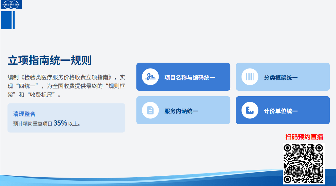 国家医保局所推行的“统一”,是指统一医疗服务项目的名称、内涵、计价单位和分类框架。简单来说,今后全国各地医院的检验科项目将有统一的“语言体系”和“编码系统”。例如,“血常规检查”无论在哪个省份,都将指代相同的检验内容、采用相同的计量单位。