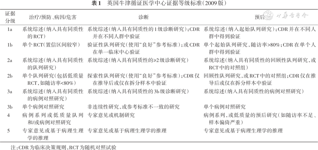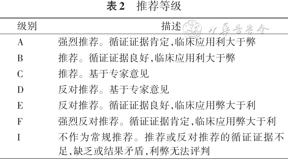 随后,通过专家会议研讨与修订确定了11条推荐意见。本建议采用2009版英国牛津循证医学中心 [ 6 ] 的证据分级标准( 表1 )对推荐意见的支持证据进行评级;专家组基于证据等级进行深入讨论,综合临床经验确定推荐等级( 表2 )。最终,基于循证证据和确定的推荐意见起草专家建议初稿,并通过邮件和会议的形式集结专家组成员进行评审,根据评审意见对共识初稿进行修改,修改稿经所有专家确认后定稿。