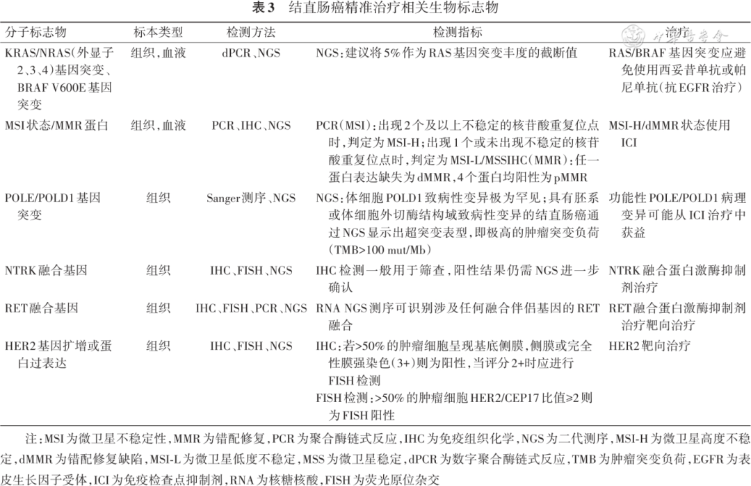 结合国内外相关指南与共识 [ 9 , 33 , 34 , 104 , 105 ] 对结直肠癌精准治疗的相关生物标志物的推荐见 表3 。